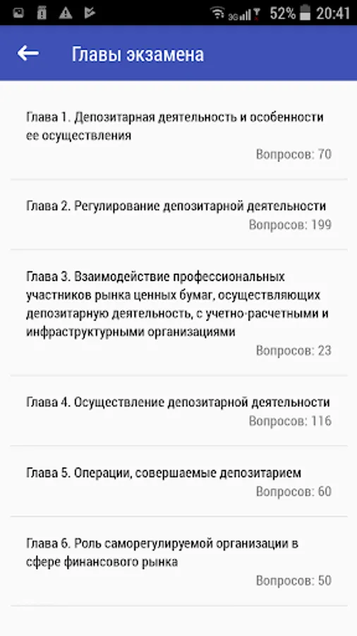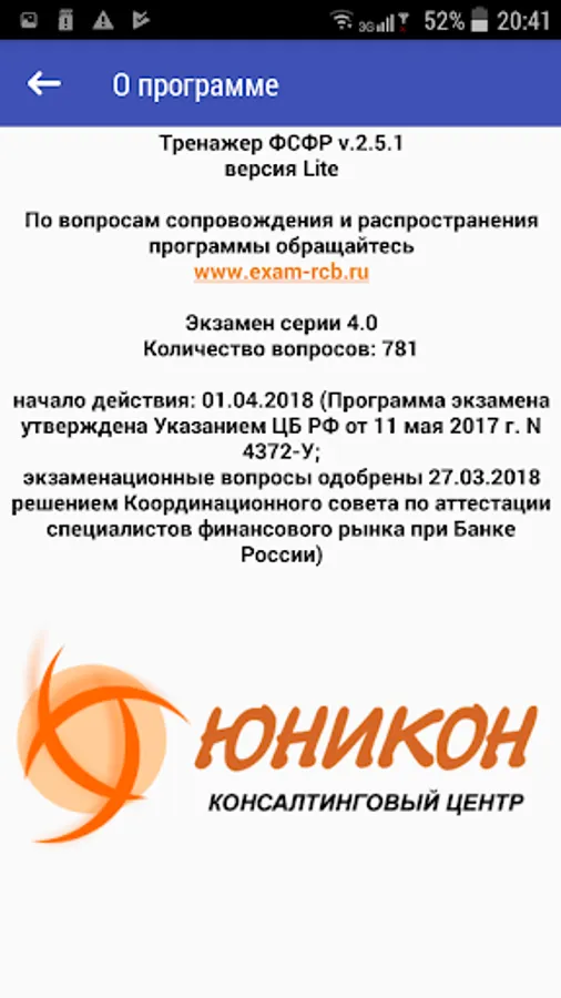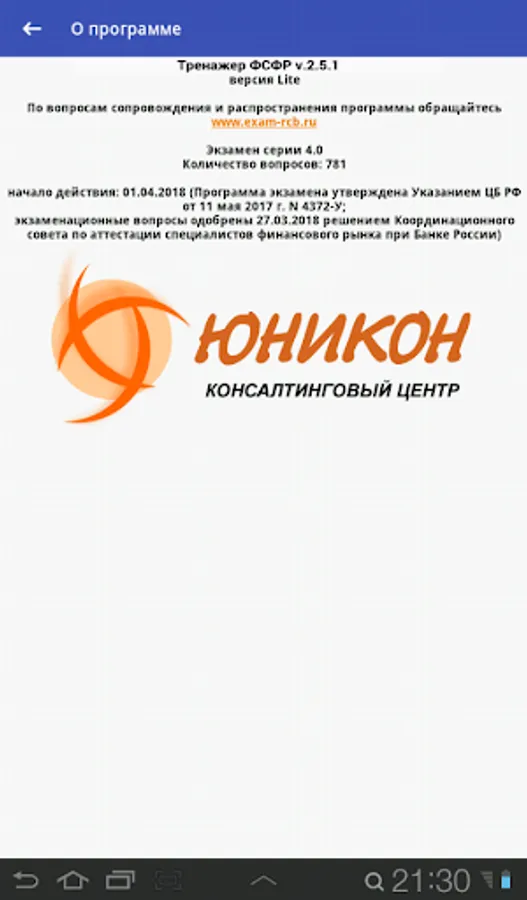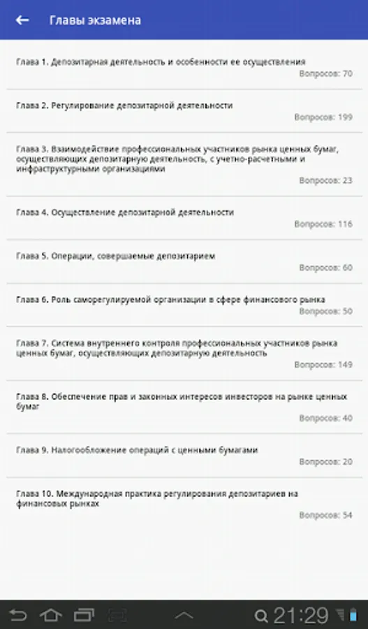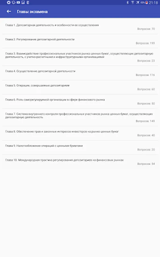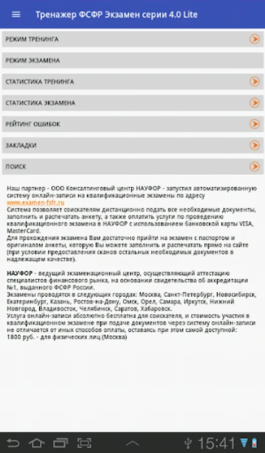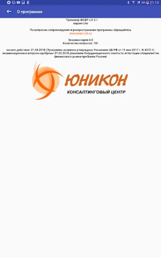 2. Exam mode: designed to simulate the qualifying exam of the Federal Financial Markets Service. When passing the examination test, a sample of all the topics is randomly selected from all the topics in proportion to the test standards, taking into account the "weight" of each question, which fully corresponds to the order of the real qualification examination when passing the FSFM certification. The time allotted for the exam can be configured individually (by default - 2 hours). Upon completion of the exam, you have the opportunity to familiarize yourself with the test results and examine in detail all the correct and incorrect answers given by you.