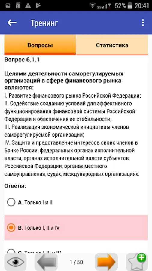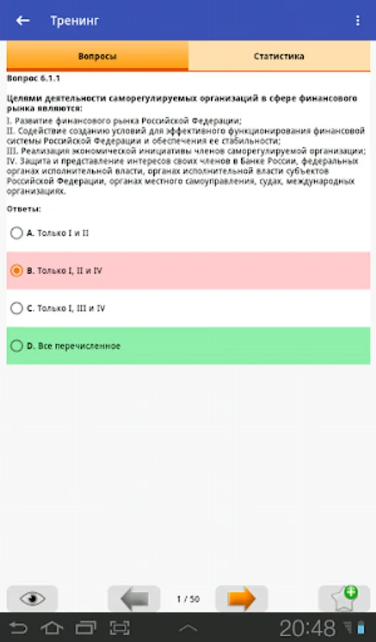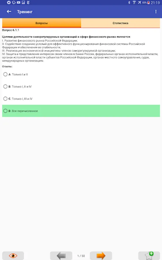 1. Training mode: designed to study exam questions on relevant chapters, sequentially or selectively. Display of the correct answer is possible, as well as the inclusion of the prompt mode (when the correct answers are accompanied by a brief explanation or links to regulatory documents, the tasks are supplemented with a description of the solution and the color scheme for highlighting keywords in the question text is used).