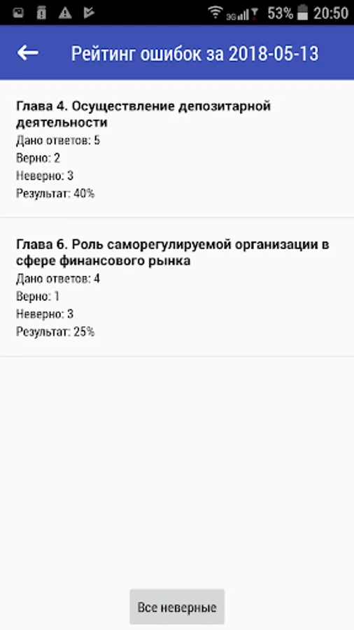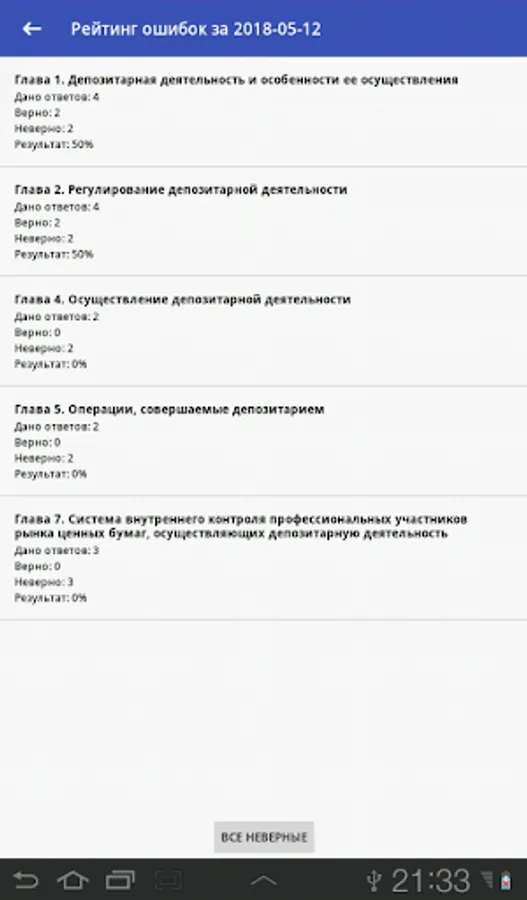 3. Statistics: the results of all the tests you pass (both in the training mode and in the exam mode) are saved, which allows you to further analyze the effectiveness of training both in the context of individual topics and by dates. You can view all the incorrect answers given by you, as well as try re-answering these questions.