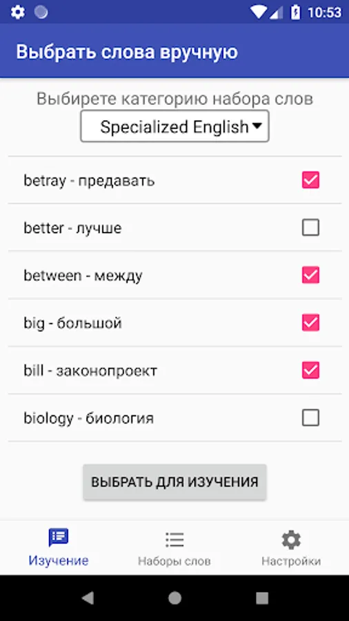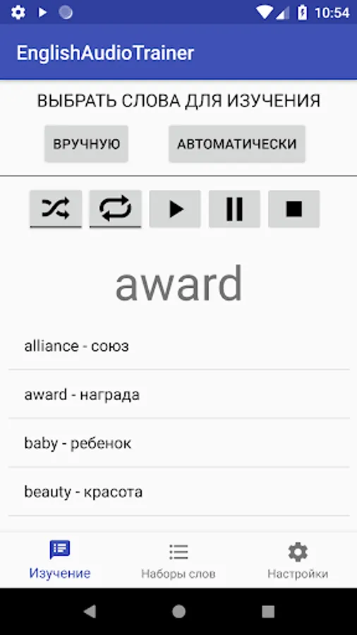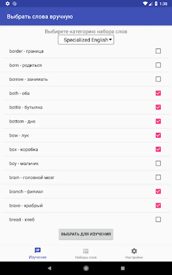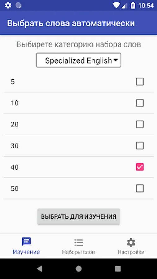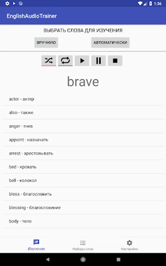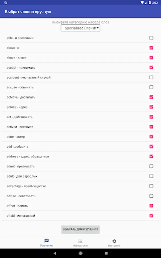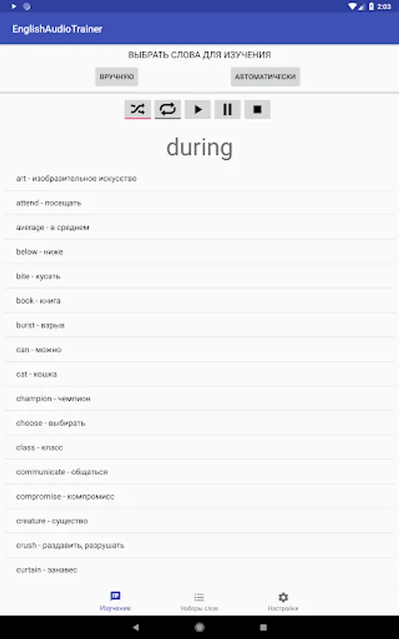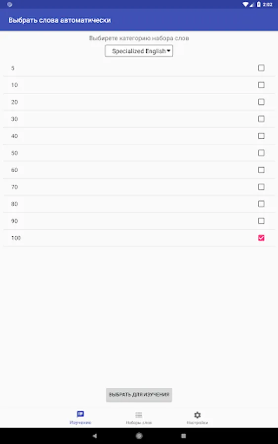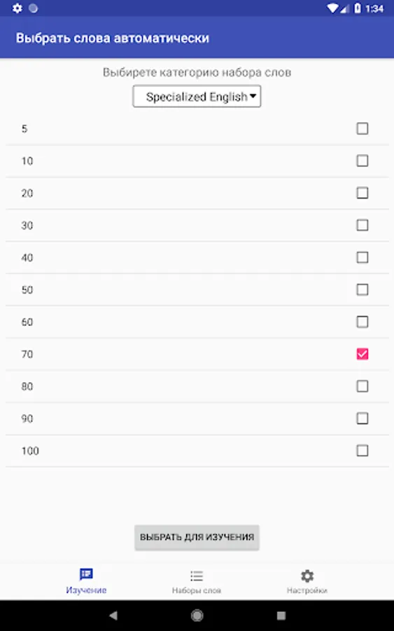 In mobile applications, in the "Study" you can select a word to study. There are two ways to study the choice of words: "manual" and "automatic". If you use a variety of words "hand" you will need to choose your own words to study. If you use the "automatic" method of selecting words, you will need to select the number of words you want to learn, and the word for the study are randomly selected from the selected set of words.