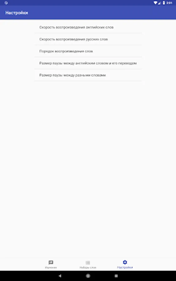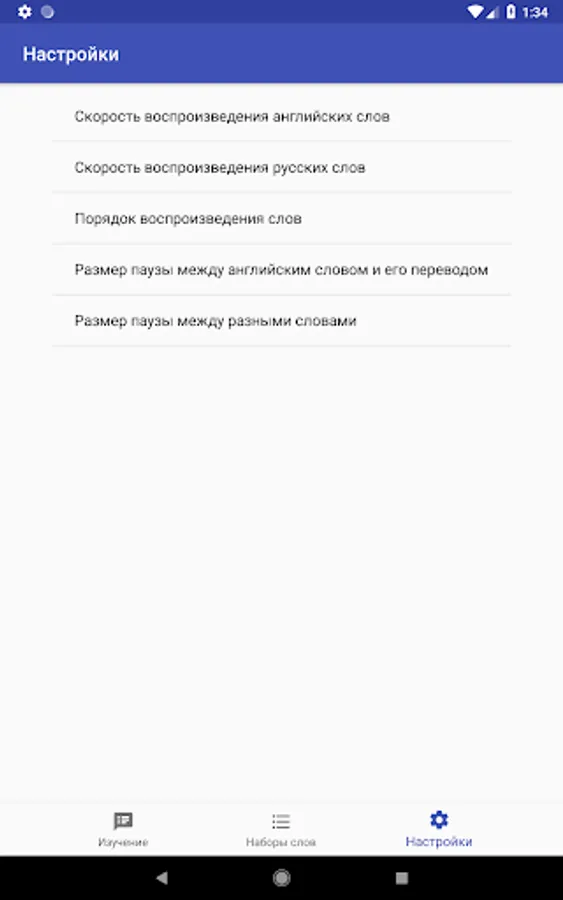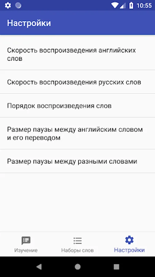 On the mobile app, in the "Settings" tab, you can adjust the speed of the pronunciation of English words and their translations, as well as the value of the pause between the pronunciation of the word.