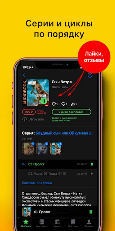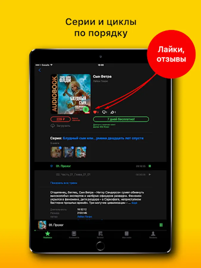 ・ Books are collected in the Series. If the audiobook has a sequel, you will immediately see it in the “Series” block