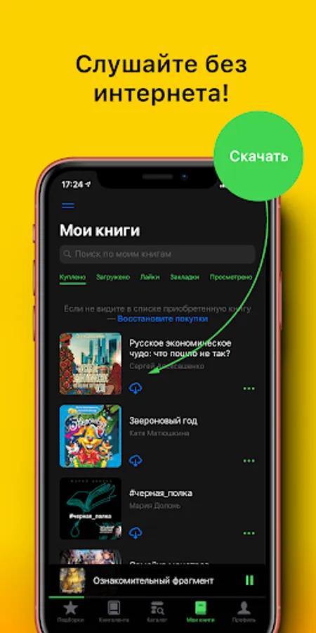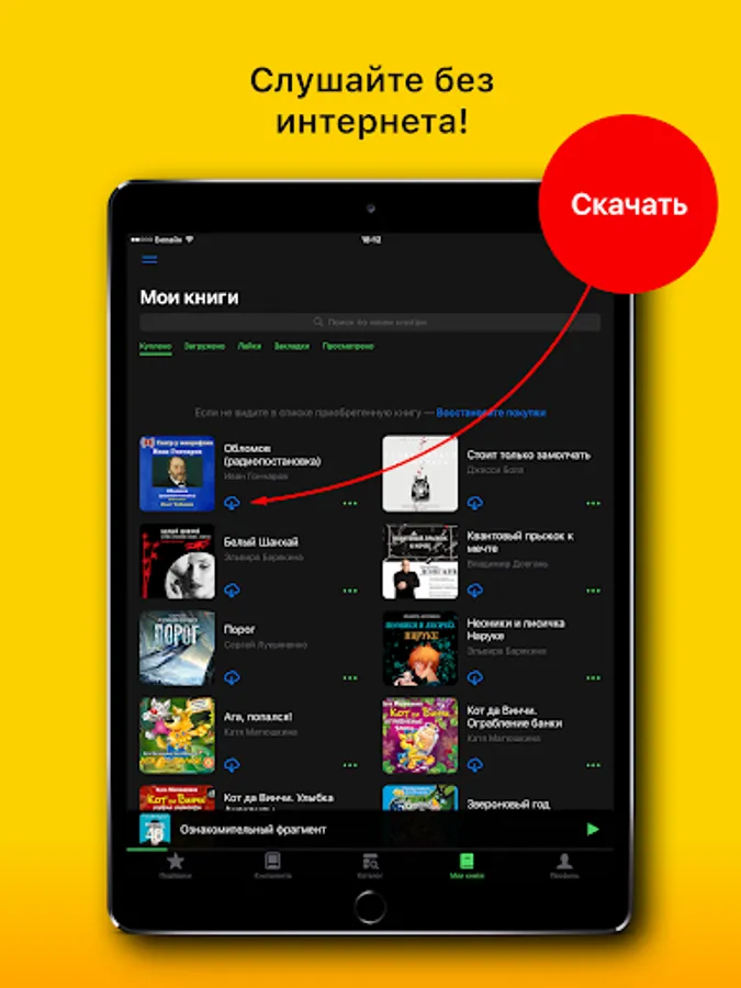 Subscribe and at the price of a comprehensive lunch you get access to the entire database of audio books. You can download any audiobooks to your device and listen to them without the Internet.