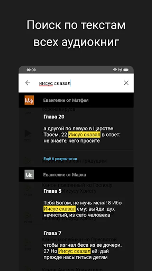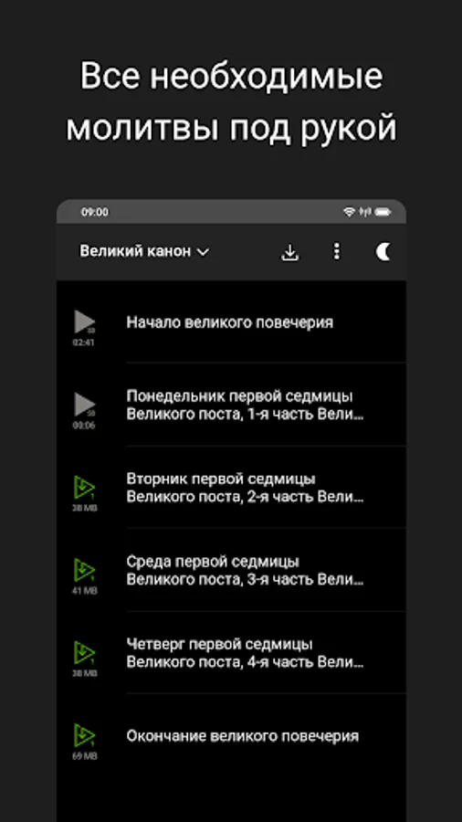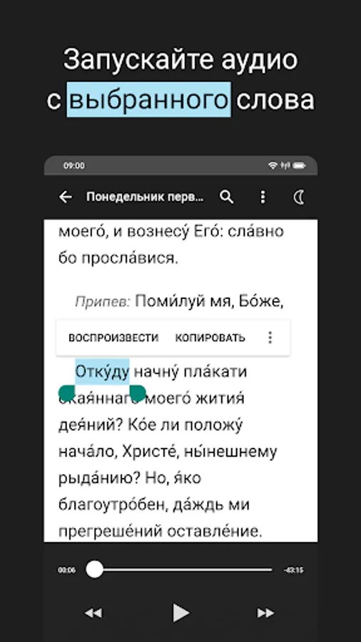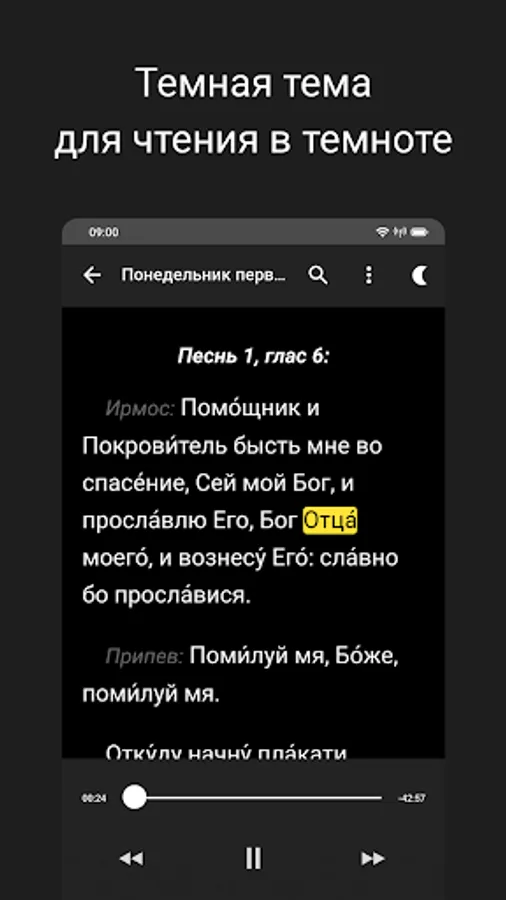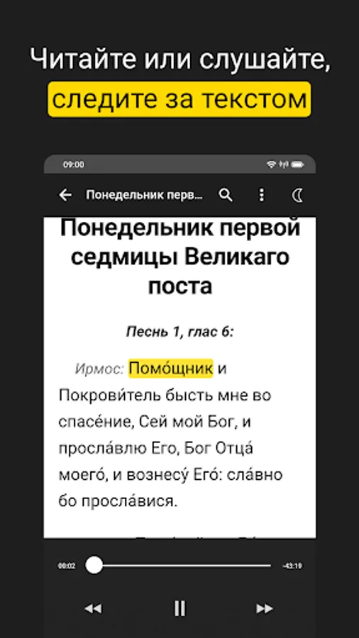 Highlighting the words spoken in the audio recording allows you to follow the text, helps you better understand and remember prayers.
