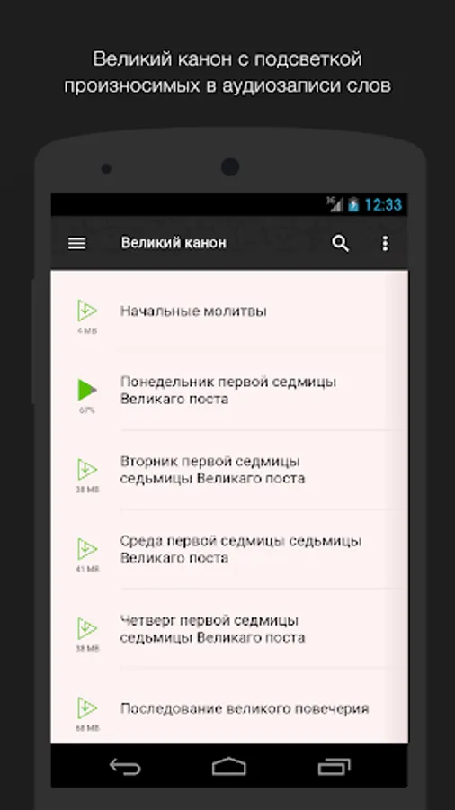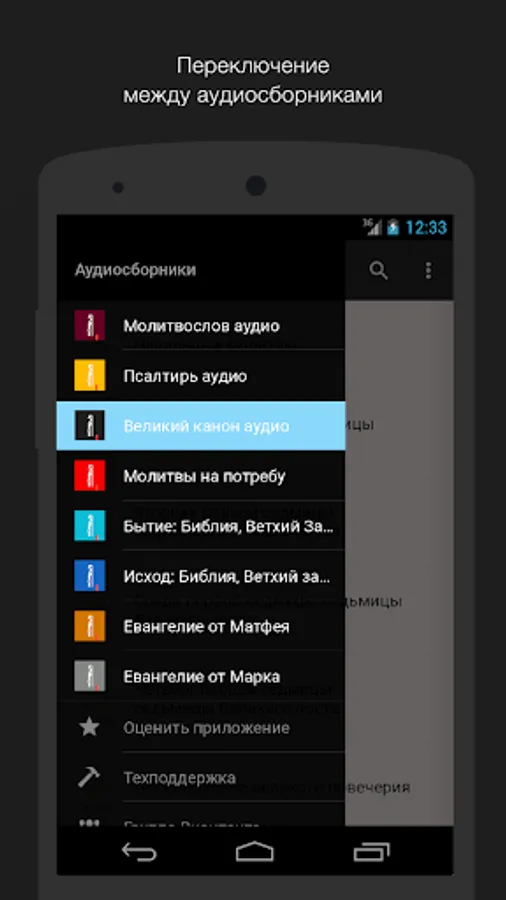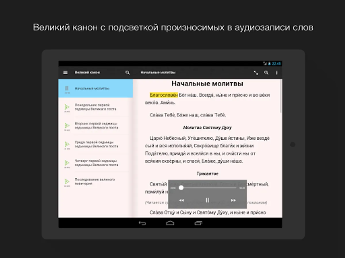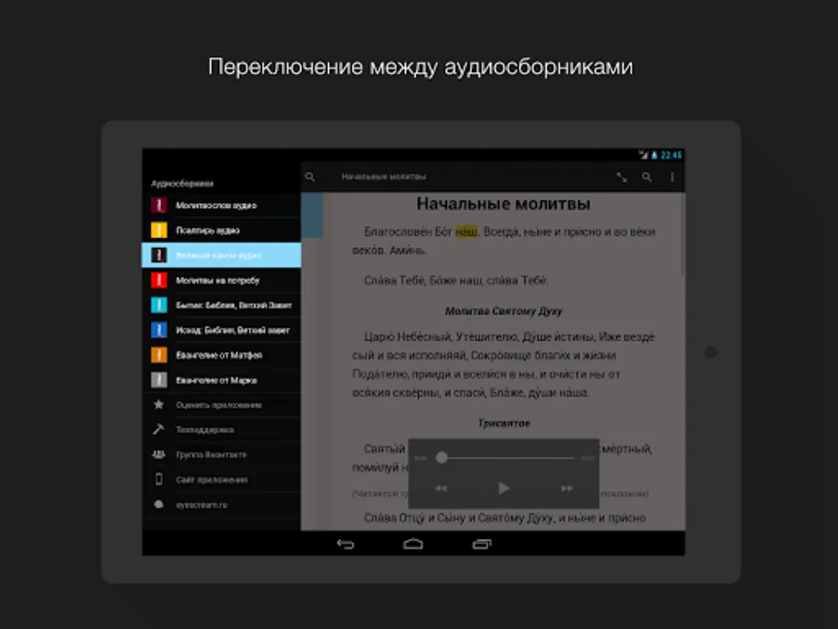 · Easy switching between orthodox thematic audiosbornikami through drop-down menu;