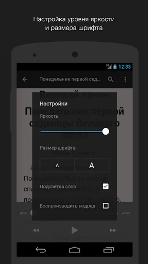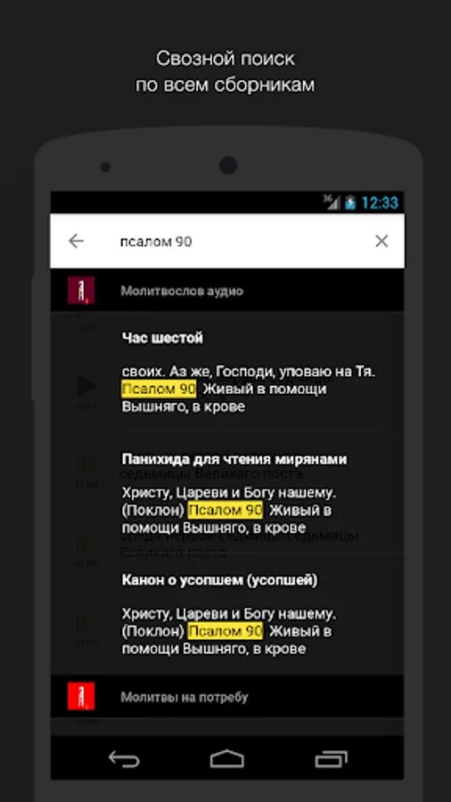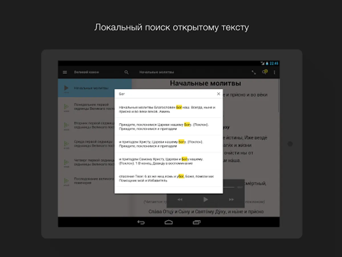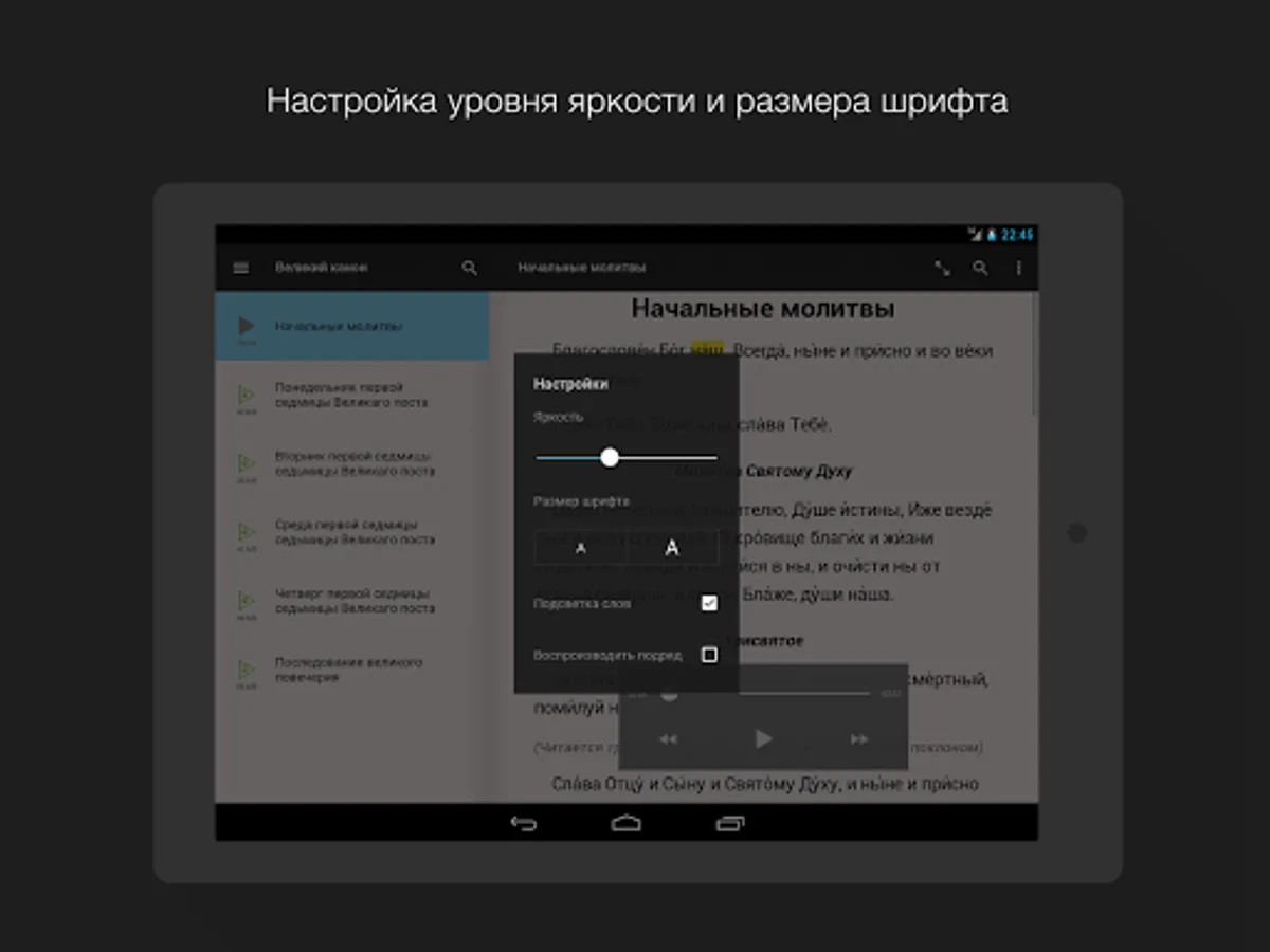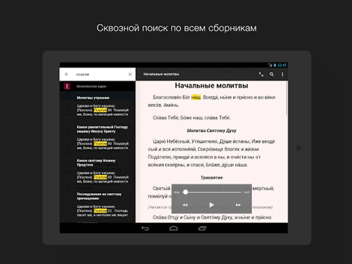 · Easy switching between orthodox thematic audiosbornikami through drop-down menu;