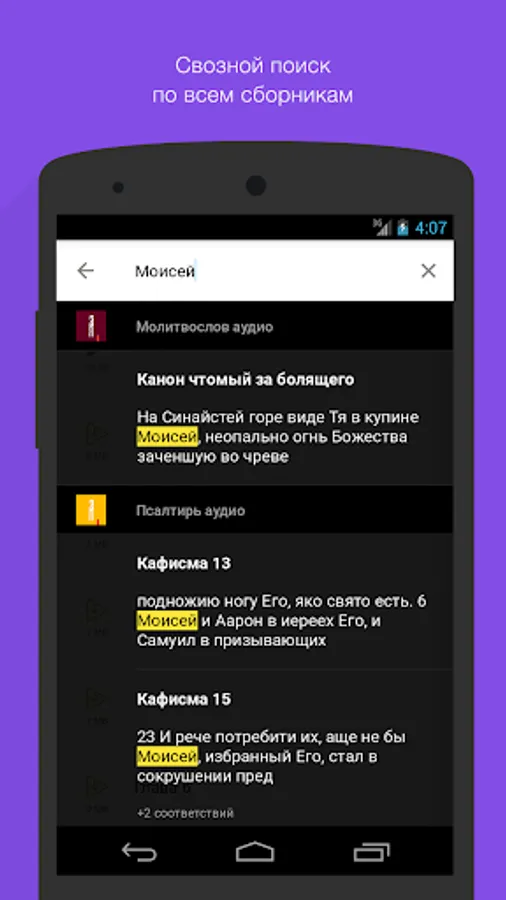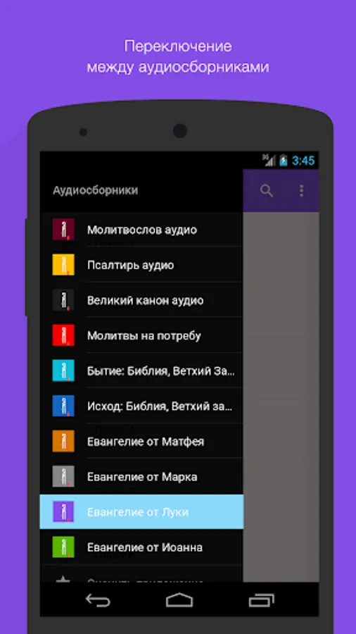 · Easy switching between orthodox thematic audiosbornikami through drop-down menu;