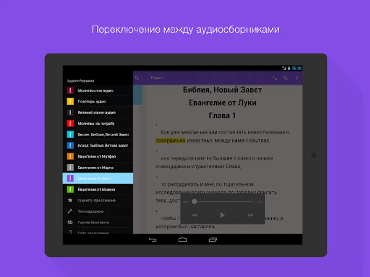 Because applications are available other Orthodox collections: "Prayer," "Psalm", "Great Canon of St. Andrew of Crete", "Prayers needful", "Genesis: the Bible, the Old Testament", "Exodus: the Bible, the Old Testament," "The Gospel of Matthew Bible, New Testament, "" The Gospel of Mark Bible, New Testament, "" The Gospel of John: the Bible, the New Testament. "