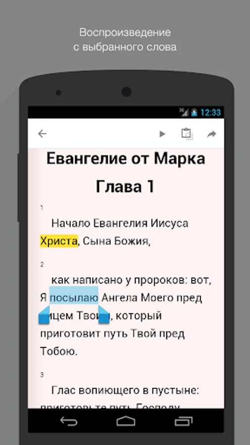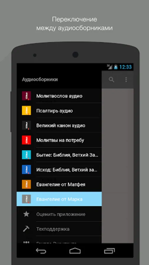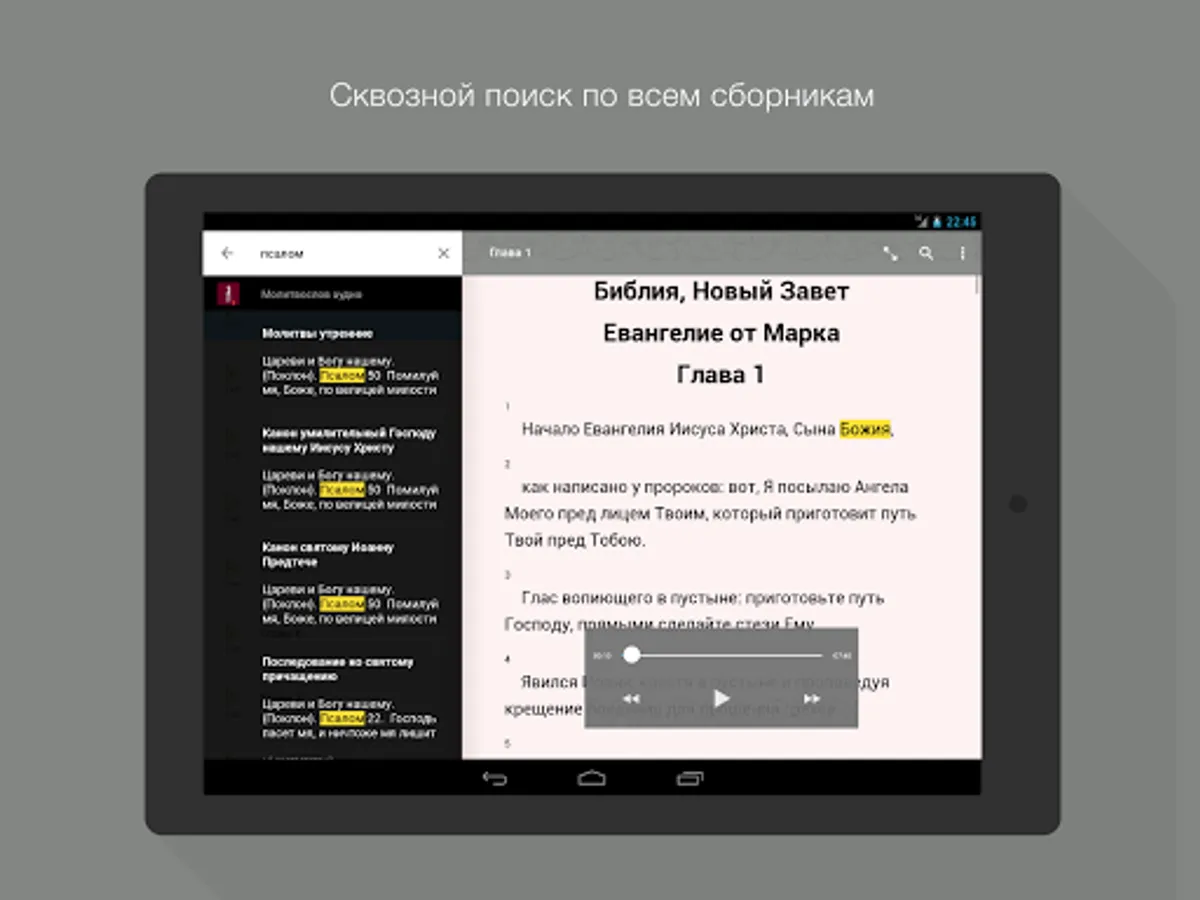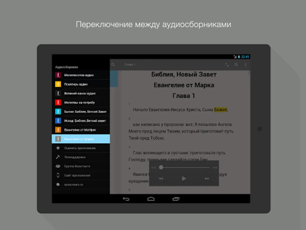 Because applications are available other Orthodox collections: "Prayer," "Psalm", "Great Canon of St. Andrew of Crete", "Prayers needful", "Genesis: the Bible, the Old Testament", "Exodus: the Bible, the Old Testament," "The Gospel of Matthew Bible, New Testament, "" The Gospel of Mark Bible, the New Testament. "