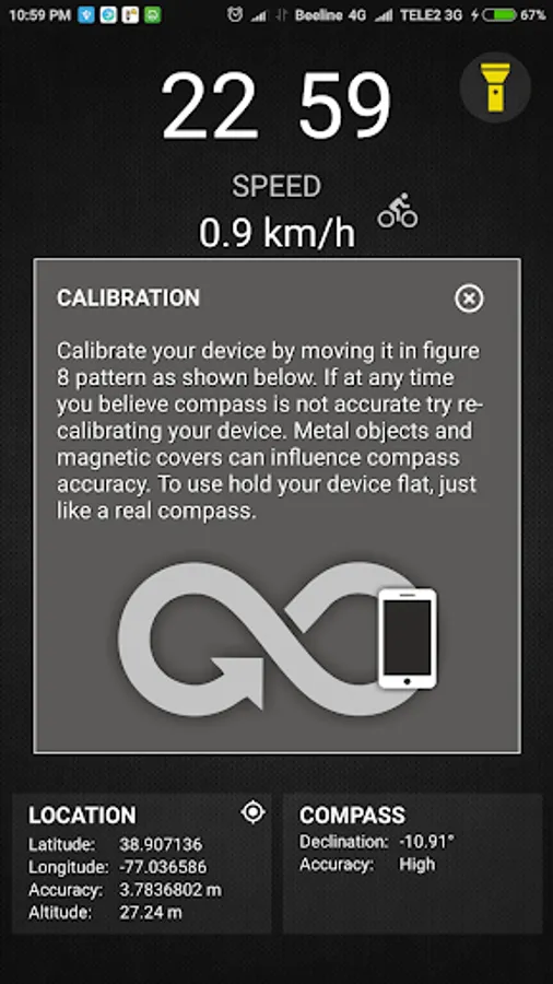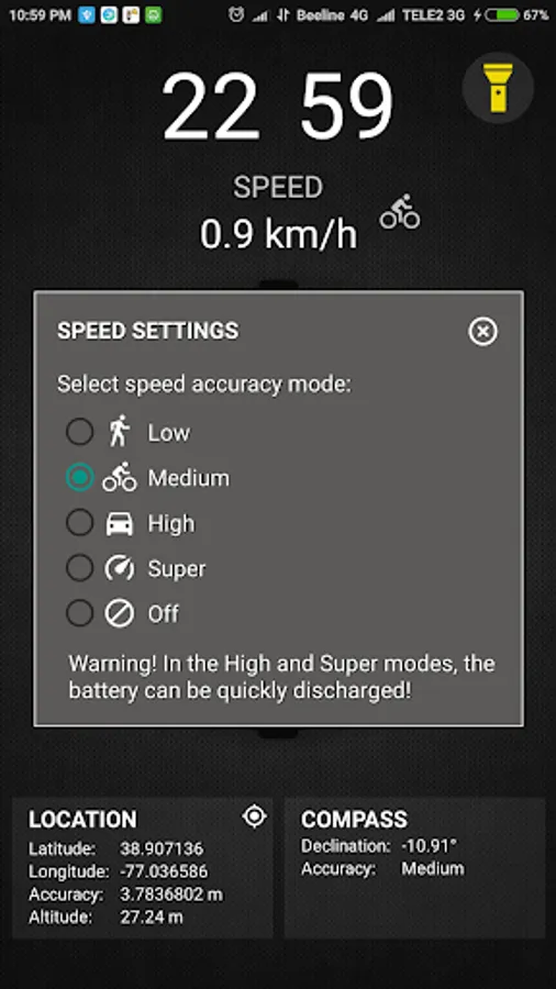 Our compass has a built-in speedometer with 5 modes of accuracy - the chosen accuracy will determine the power consumption of your phone and will allow you to extend the time of its operation, which is important in the distance from the outlet.