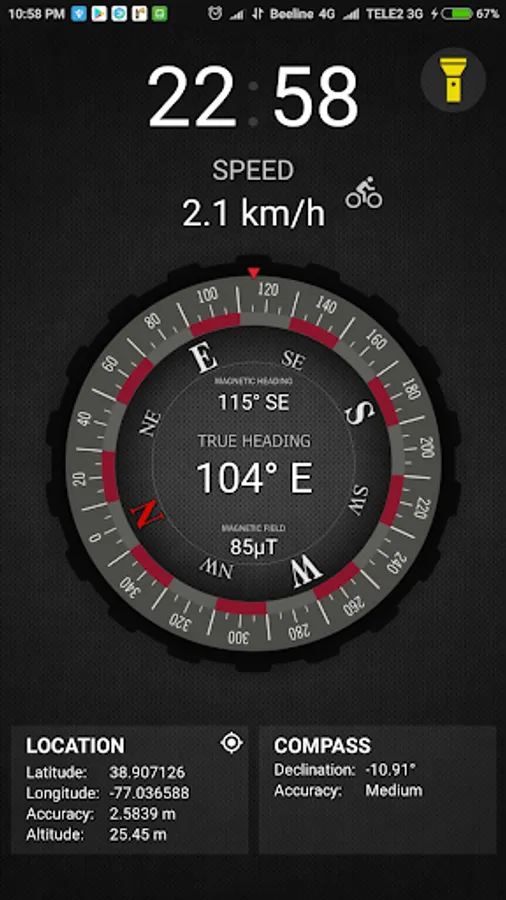 The application is easy to use and works like a real compass - arrange the device horizontally for ease of use. The rotating dial of the compass will point you to the north. Point the device to the desired direction and the compass will show you the true and magnetic azimuths, the coordinates of the location (latitude and longitude), altitude above sea level, the accuracy of the readings.