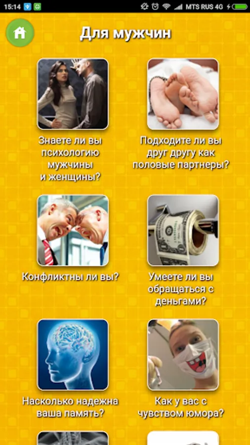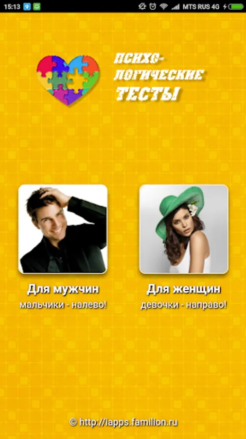 This application - a collection of popular and interesting psychological tests. There are different tests for both men (boys) and women (girls). All tests are written by professional psychologists, easy to understand and will not take much of your time, but will let you know about yourself or your partner a lot of interesting things.