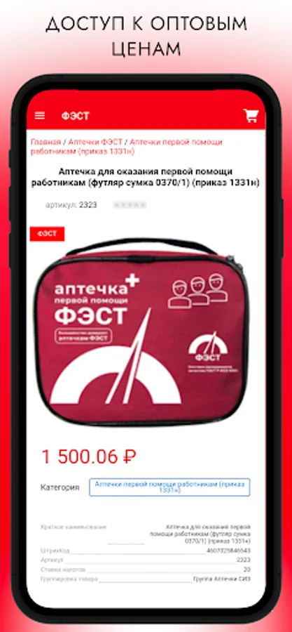 Unique discounts and offers for the mobile app only. The application presents an expanded range of first aid kits and related products from the manufacturer FEST.