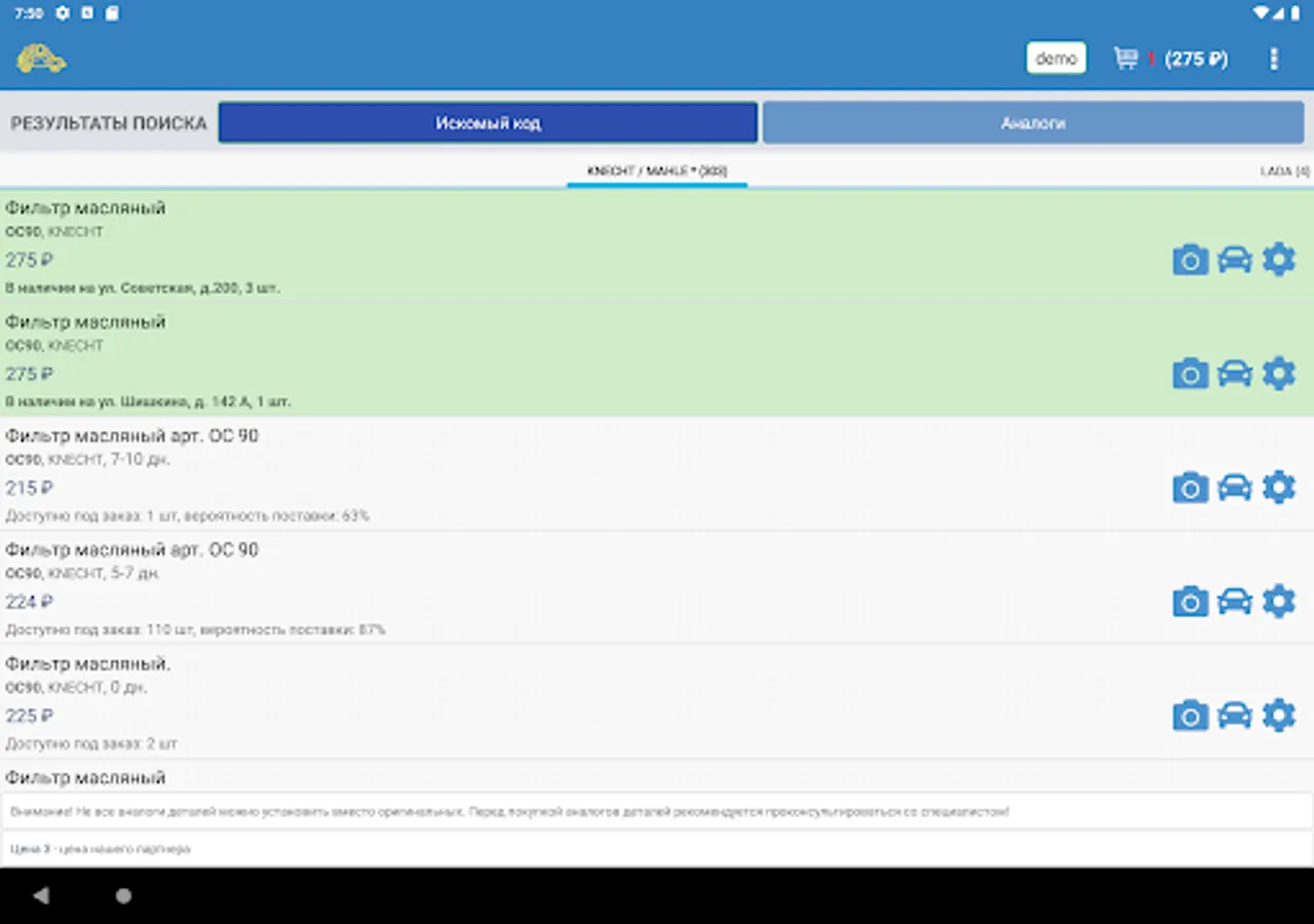 The application includes a catalog of non-original spare parts with their photos, applicability and technical specifications.