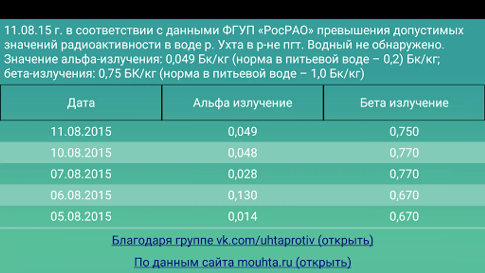 The radiation background in the water of the river near the village of Ukhta Water according to Federal State Unitary Enterprise "RosRAO."