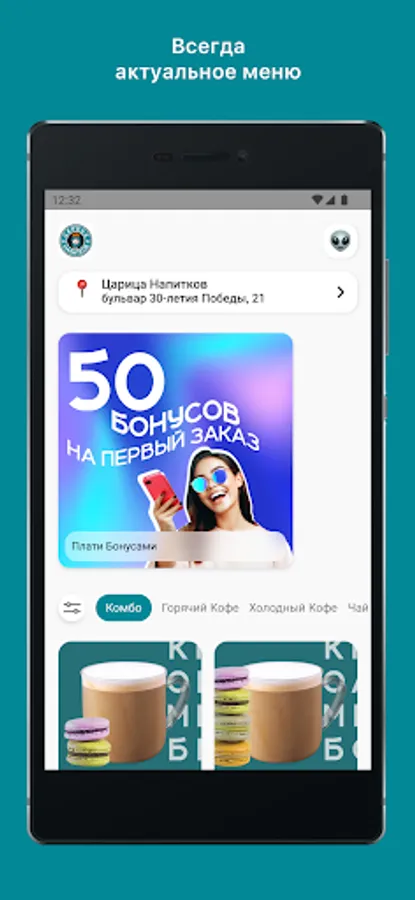 Here you can order: coffee, lemonade, water, tea, cocoa, frappuch,