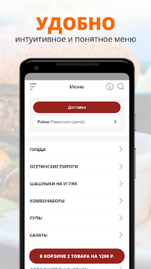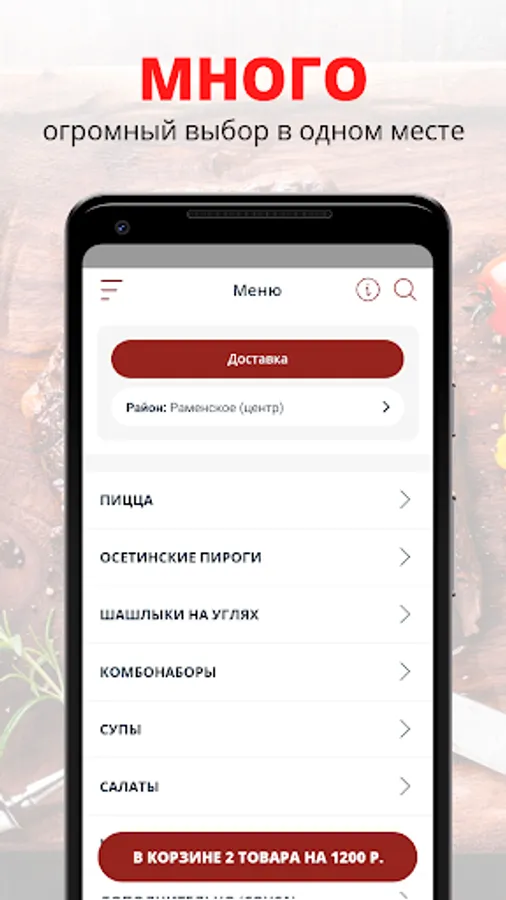 Pizza, Ossetian pies, Russian pies, Charcoal barbecue, Hot dishes, Salads, Cakes.