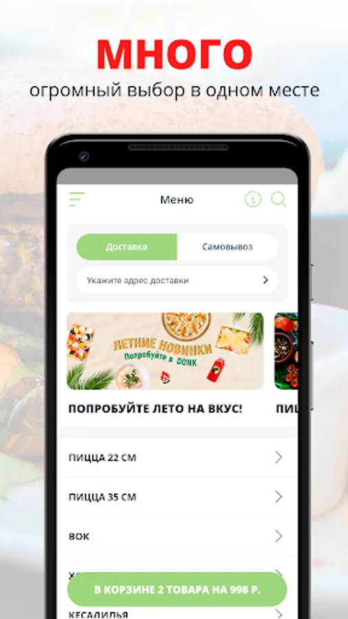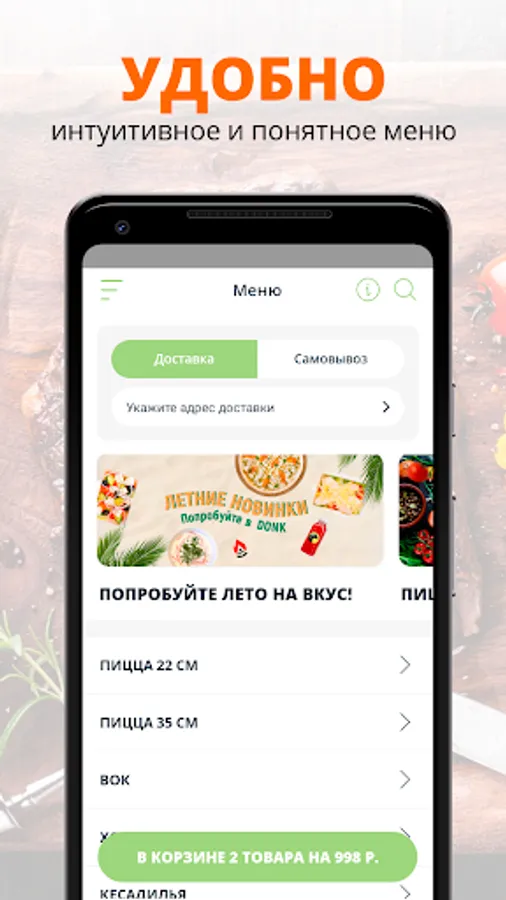 Delivery of food and drinks, ordering in a pizzeria. Promotions and discounts.