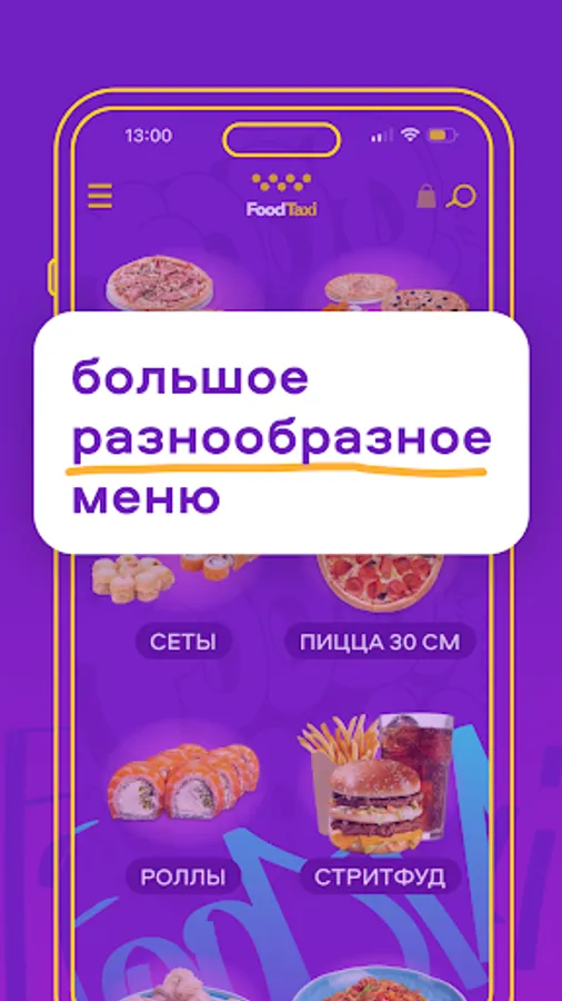 FoodTaxi does not argue about tastes, because our menu is universal. Here you will find fire pizzas, cool rolls, street food classics and big sets for a party with friends. And as a bonus - big discounts on all dishes!