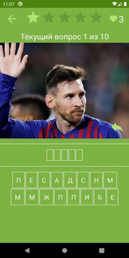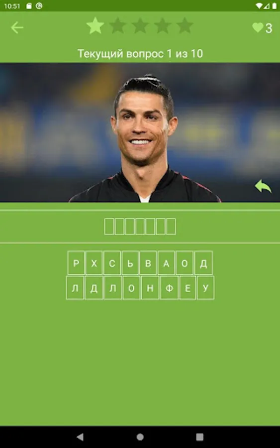 During the quiz, you have to collect the name of the football player in the photo from the letters presented. Each level asks 10 questions and has a limited number of opportunities for error.