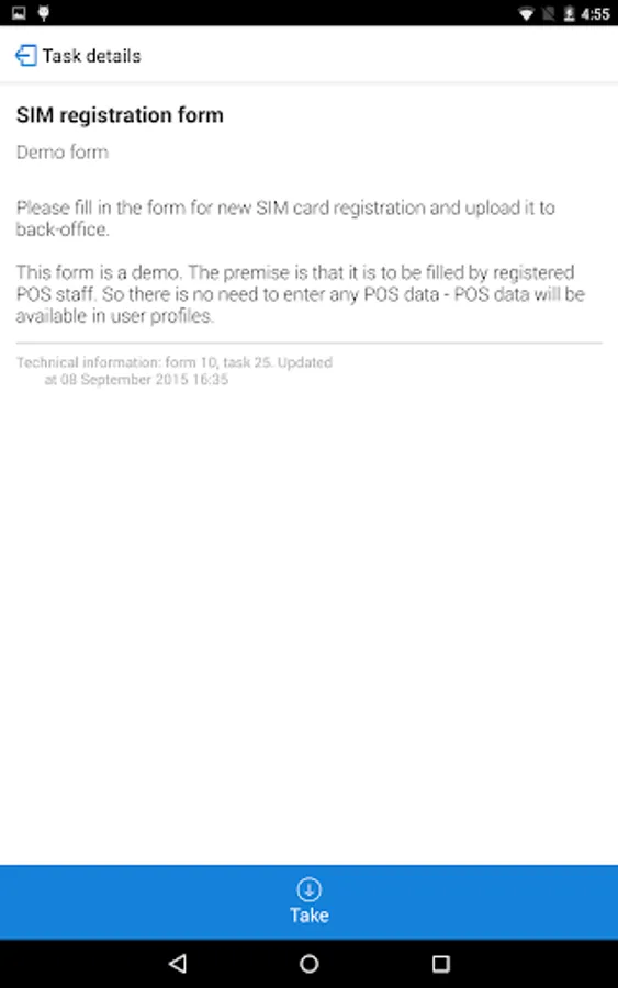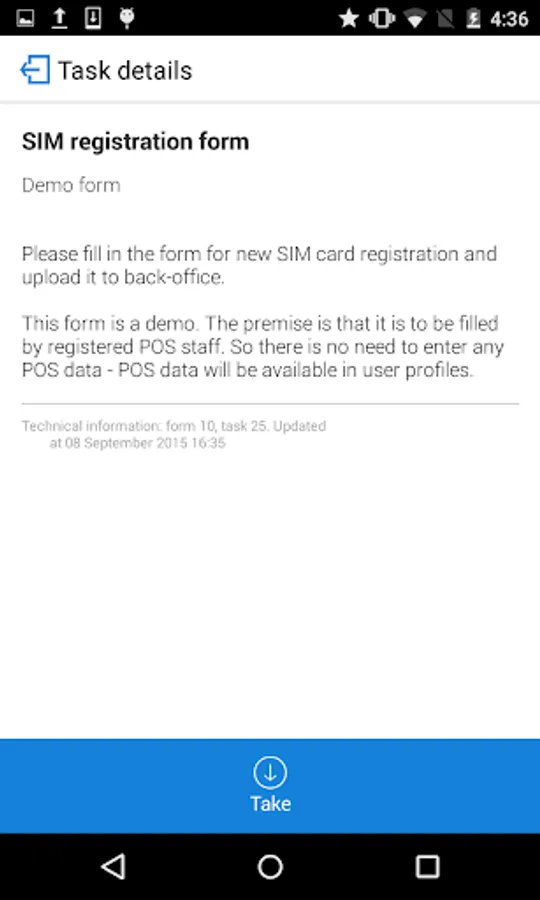 Any task in the system is linked to a form with step-by-step completion script which can be constructed on the web-server in visual builder with no technical skills. So, any new form (and new type of tasks) can be set up in no time and wirelessly transmitted to mobile applications of your field staff.