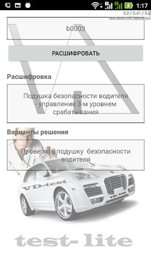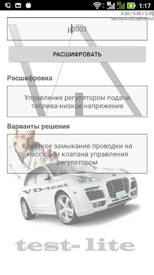 This application is designed to decrypt OBD2 errors read from the cars of different brands. Lite version is lightweight and contains in its database decryption key series of fault codes P and B. In addition to the transcripts of the program presents some options for addressing the causes of error. In total, the application provides a description of error 4330 in the Russian language. The app is universal and does not need to select the make and model of the car is enough in the upper field, enter the error code and get a transcript in the middle field and the options for addressing errors in the bottom field. When entering the error code register does not matter, you can enter it as the capital, and capital letters, but only in Latin. Through this program it is unique. If the base lite version of the data is not enough, you can always purchase the full version of the program.