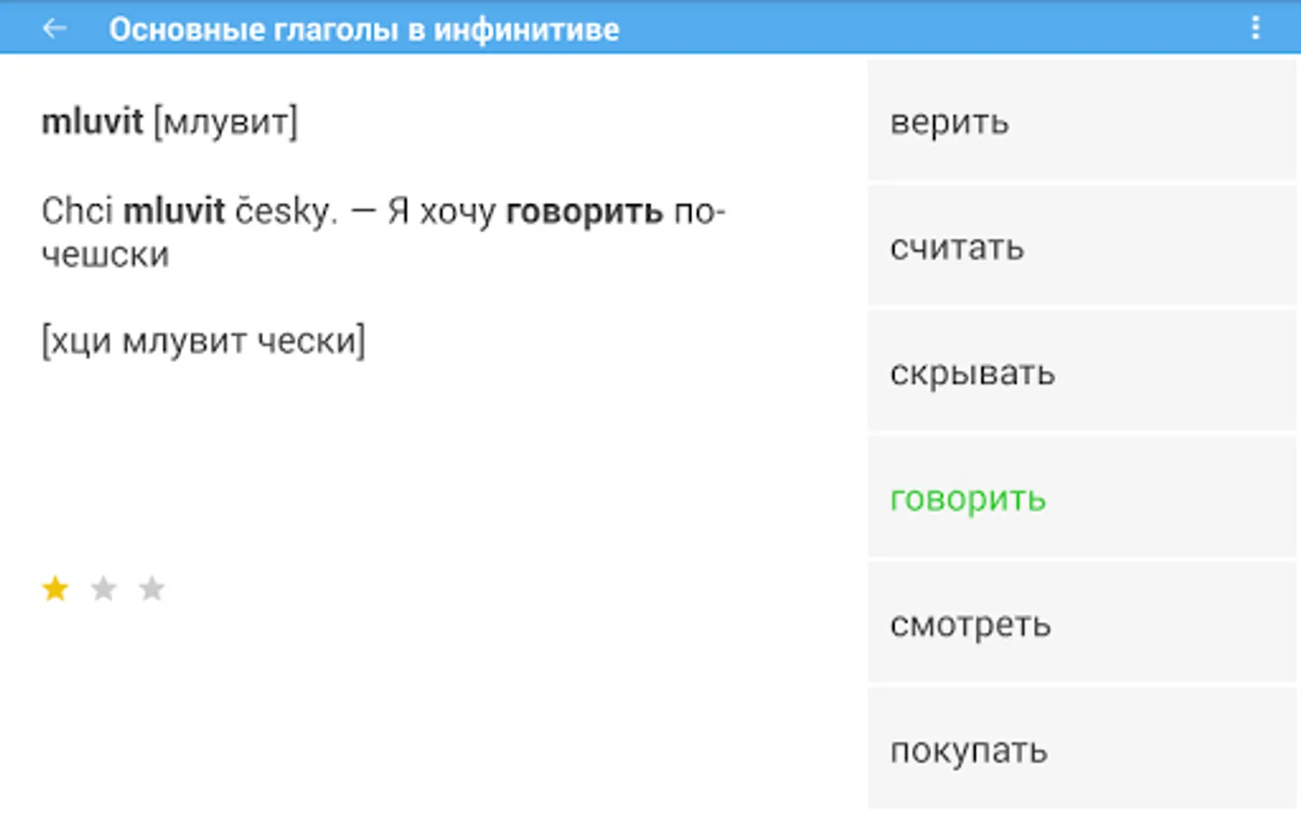 All learning is based on the tasks in the course of which the user gets a gold star. When dialing 3 stars dictionary element considered to be learned. At the same time, Czech words and phrases pronounced built speech synthesizer (controlled by the system settings of your Android).