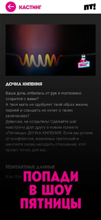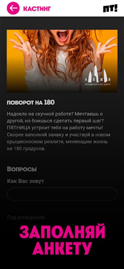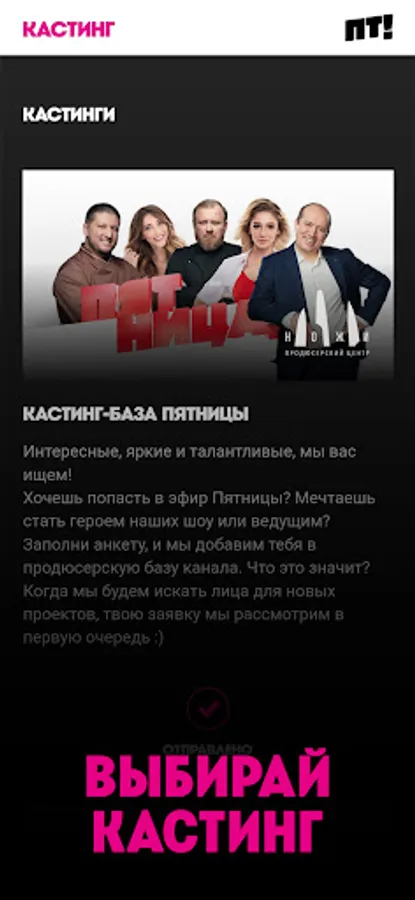 An application for sending applications for participation in castings of the Friday channel. All profiles will be included in the casting database.