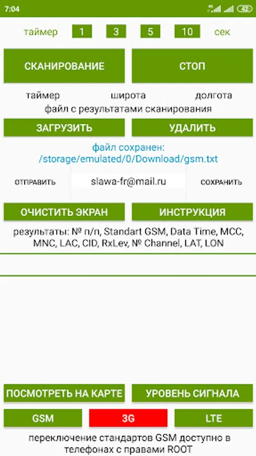 GSM scanner is designed to determine the basic parameters of GSM, display the nearest base station on the map, measure the signal strength. The file with the measurement results must be processed on a computer using the MS EXCEL program.