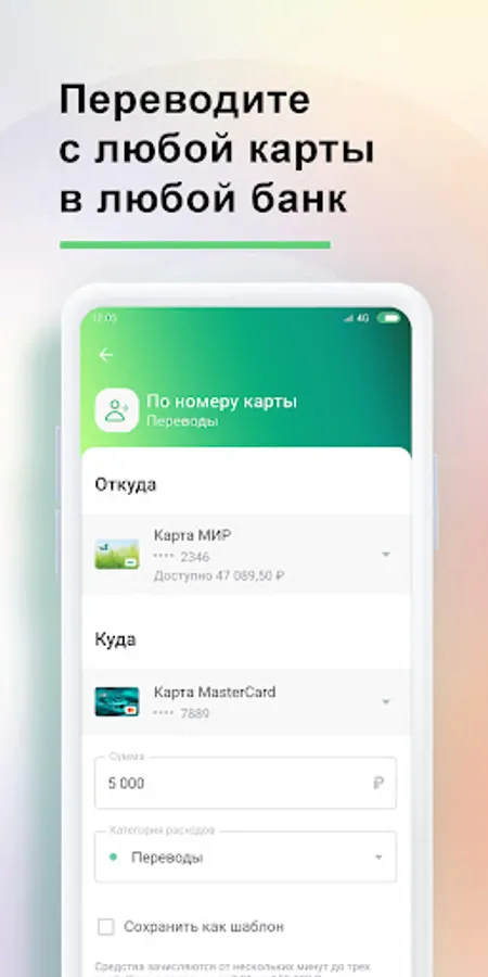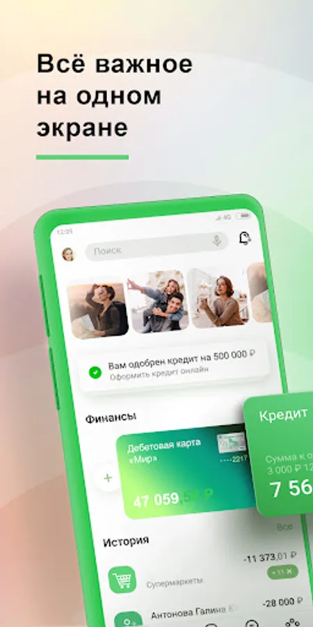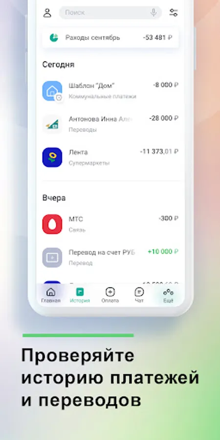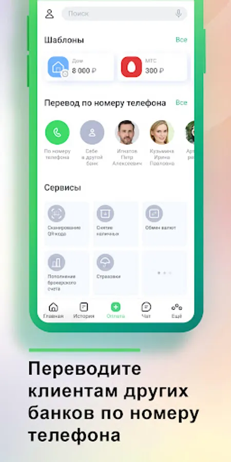 The application allows an individual to carry out basic banking operations through a mobile device: make transfers from accounts (deposits, cards), SBP transfers, pay by QR code, check the balance on their accounts, view the history of operations for any period.