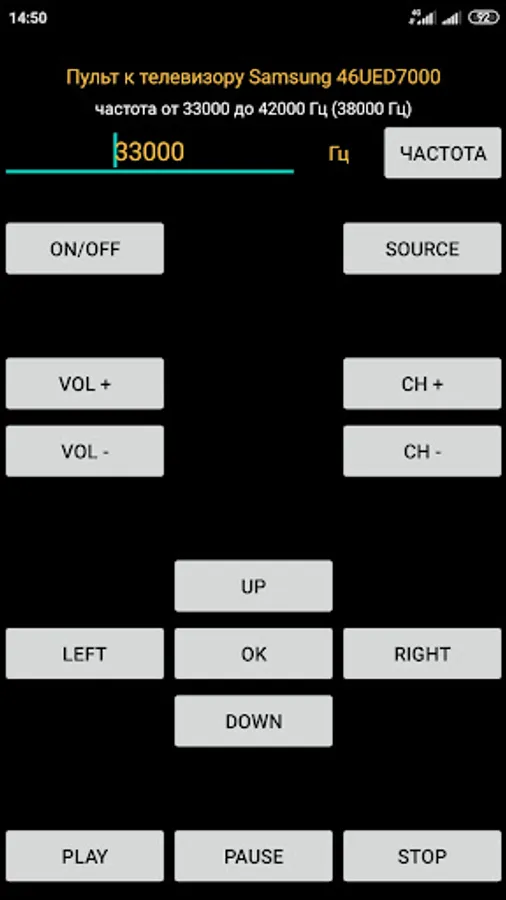 If your smartphone has an infrared port, then this application can be used as a remote control for the Samsung UE46D7000 TV. Here are the most needed buttons on the remote control.