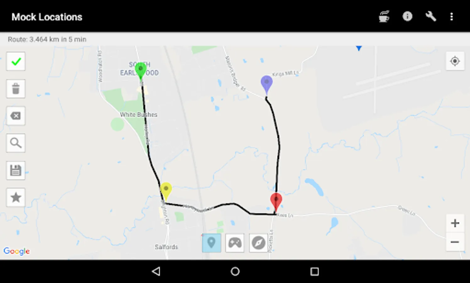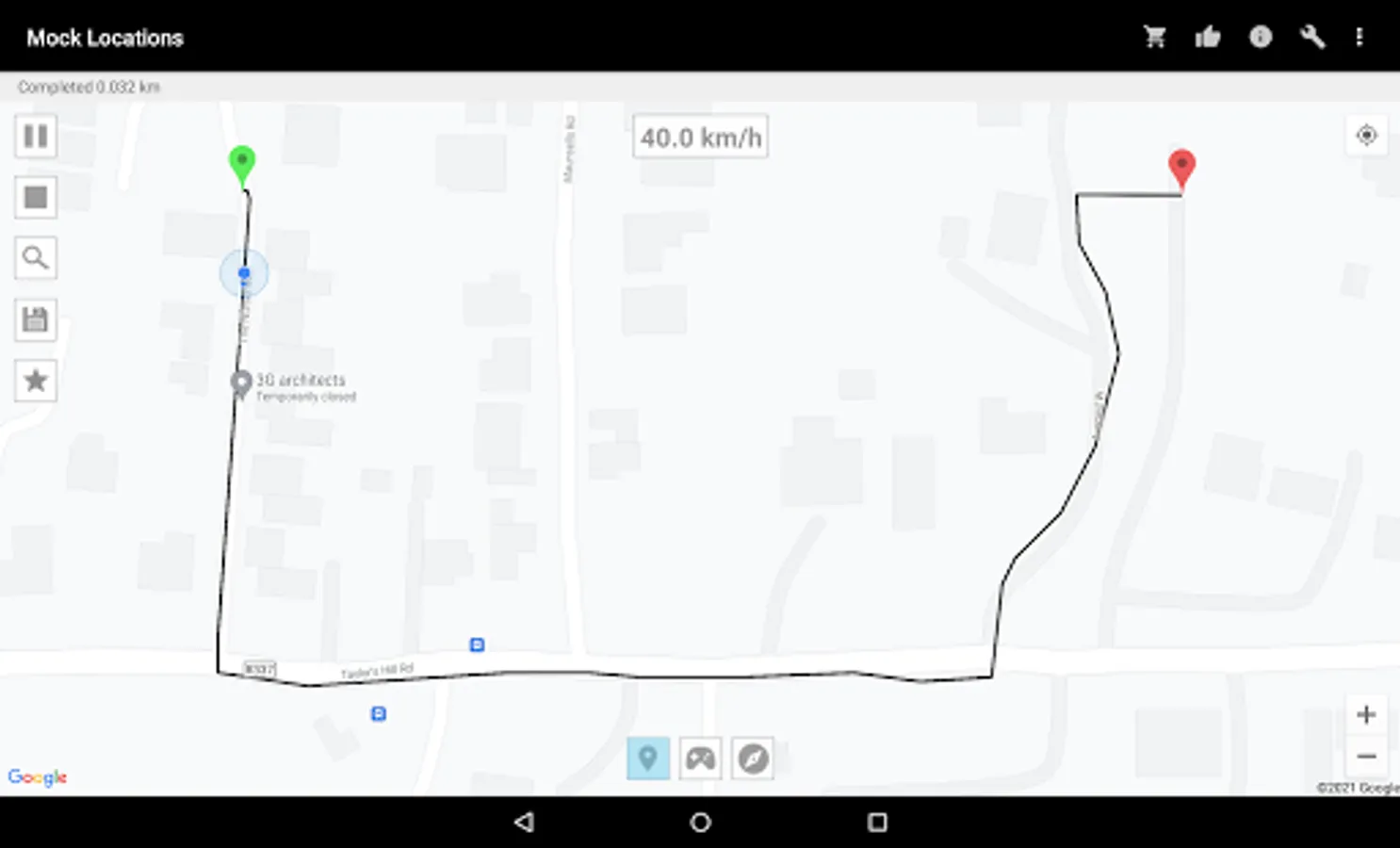 When you press the play button, the Mock Locations app starts changing your GPS coordinates step by step, as if you were actually driving that route.