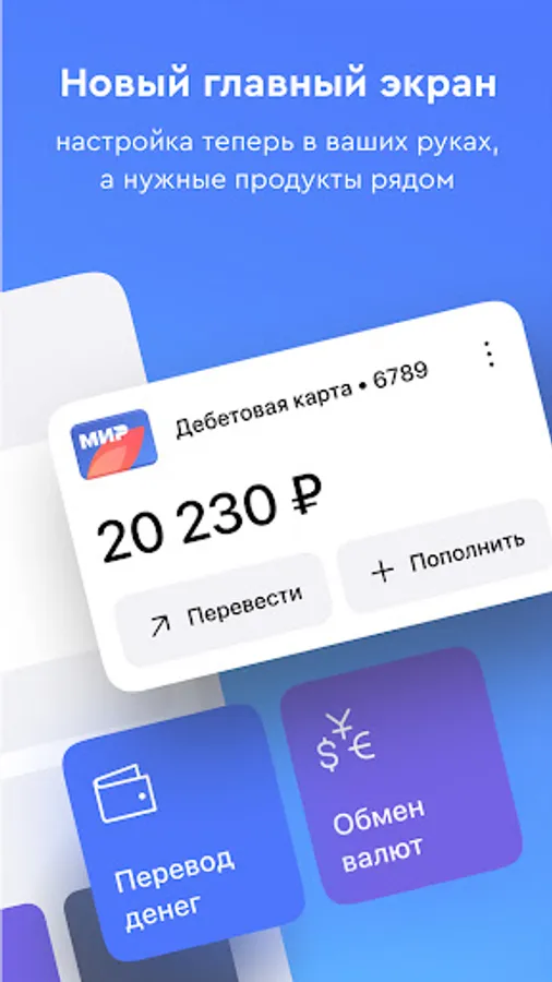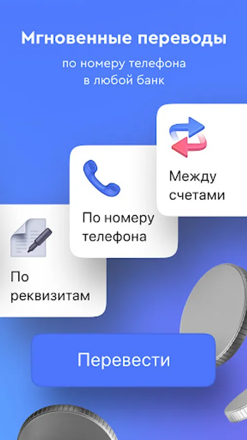 Transfer money between your accounts and cards, as well as other people by phone number, card or details. You can send transfers to legal entities and budgetary organizations.
