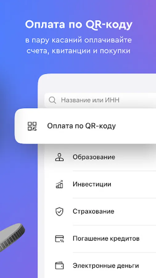 Pay for utilities, mobile communications, the Internet, transport cards, insurance, traffic police fines, kindergartens, schools and other services using a QR code or details. Save templates and auto payments for regular transactions.