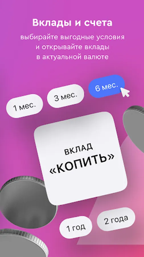 Open deposits and savings accounts in the application - it will take a few minutes. Information about savings will always be available in your mobile, you can also close an account or deposit without visiting the bank office.