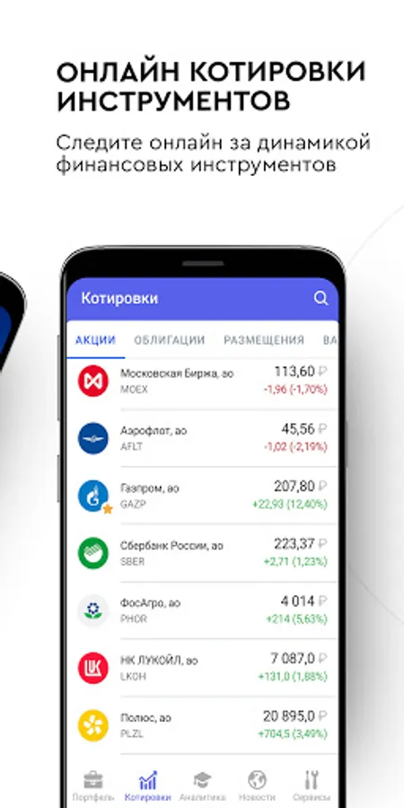 – широкий выбор инструментов для торговли: акции, корпоративные и государственные облигации, еврооблигации, индексные биржевые фонды ETF, обращающиеся на Московской бирже.