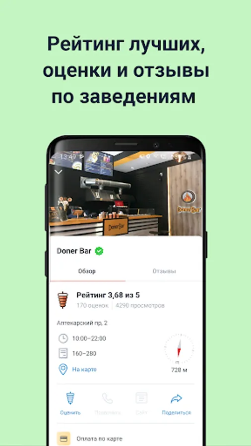 — Useful info: work time, price, hygiene, accepting cards, availability of beer and vegetarian falafel