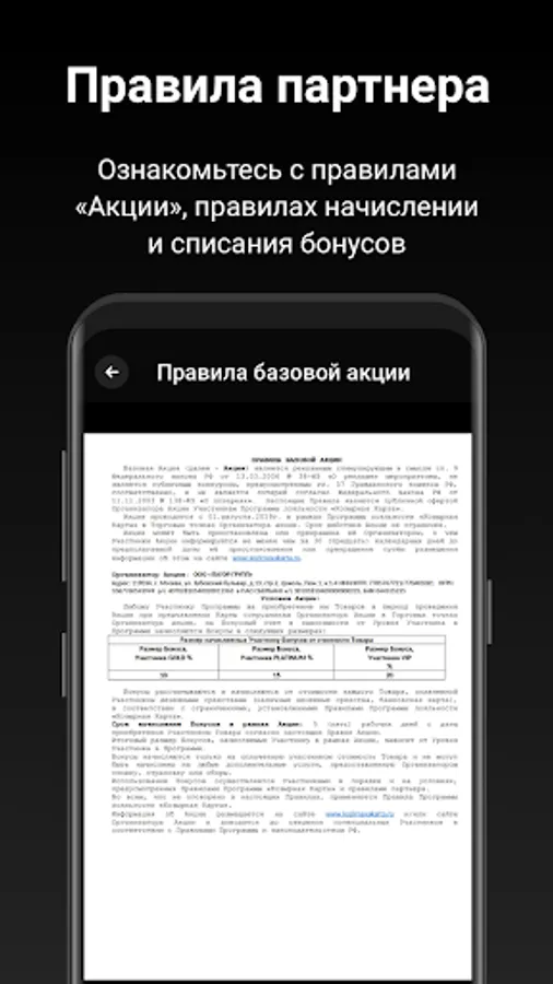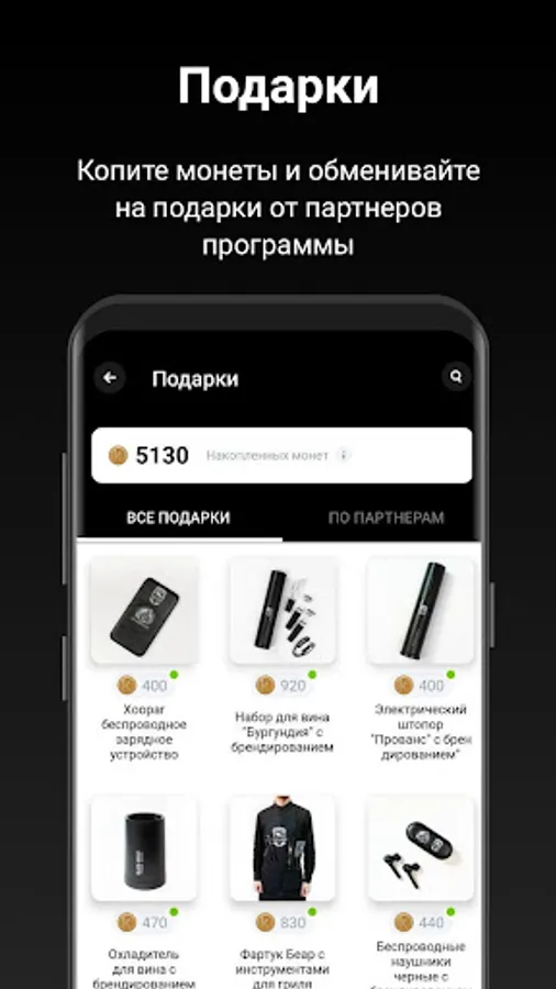 A list of promotions and discounts currently provided by partners, with a convenient search and the ability to navigate between stores.