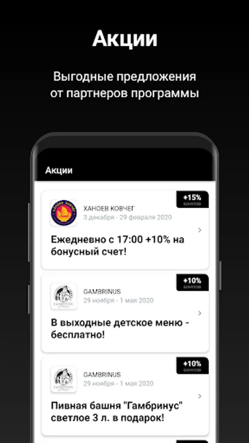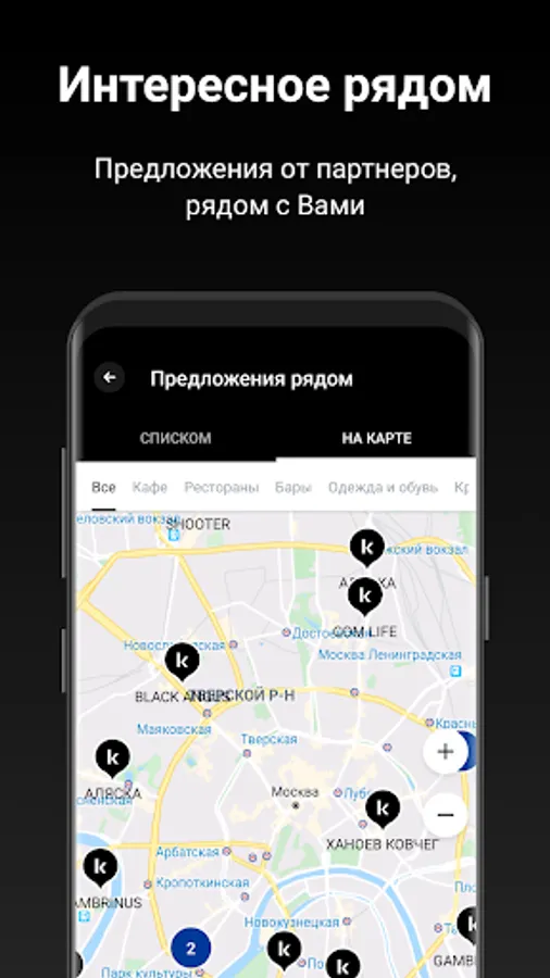 Offers from partners near you. Quickly find the nearest offers with accumulation and write-off of bonuses.