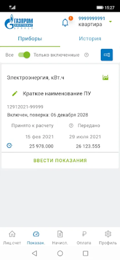Transferred readings and payments are taken into account and displayed in the service the next day!*