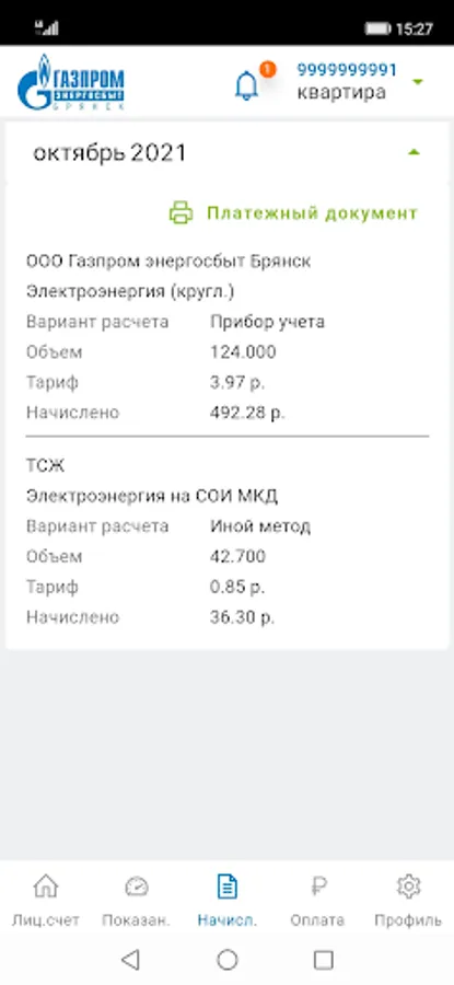 5) in the "Accruals" section, you can get acquainted with the history of accruals and the payment document (receipt) for any billing period of the previous three years.