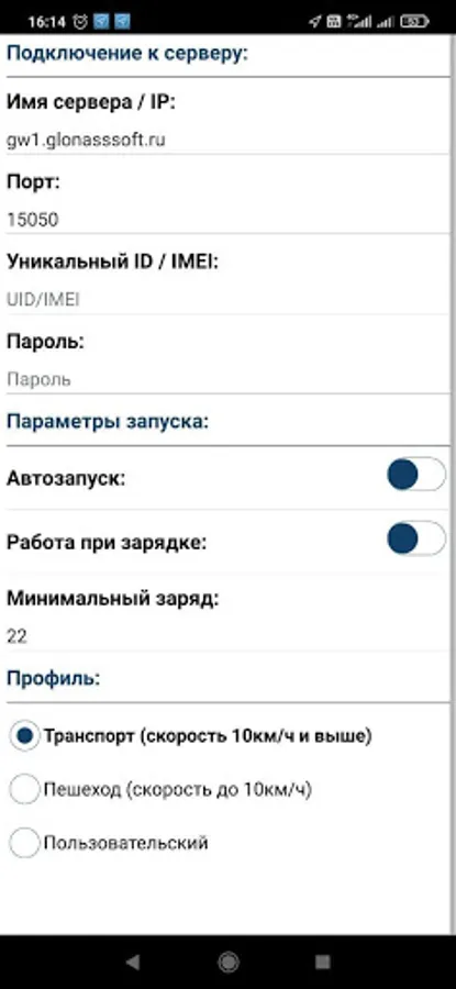 The application can be used in conjunction with the GLONASSsoft platform http://glonasssoft.ru, so you must be a registered user of this service.