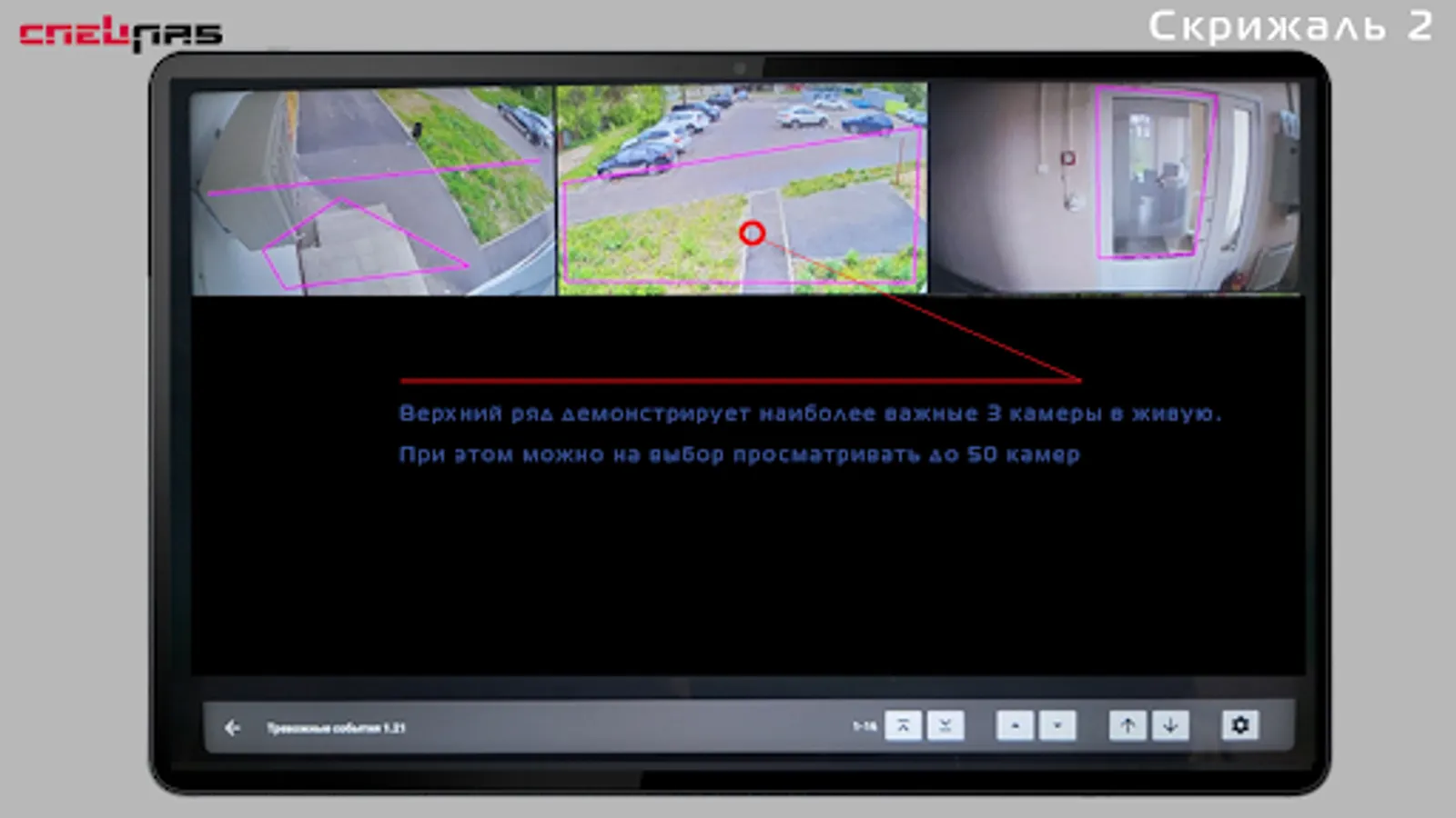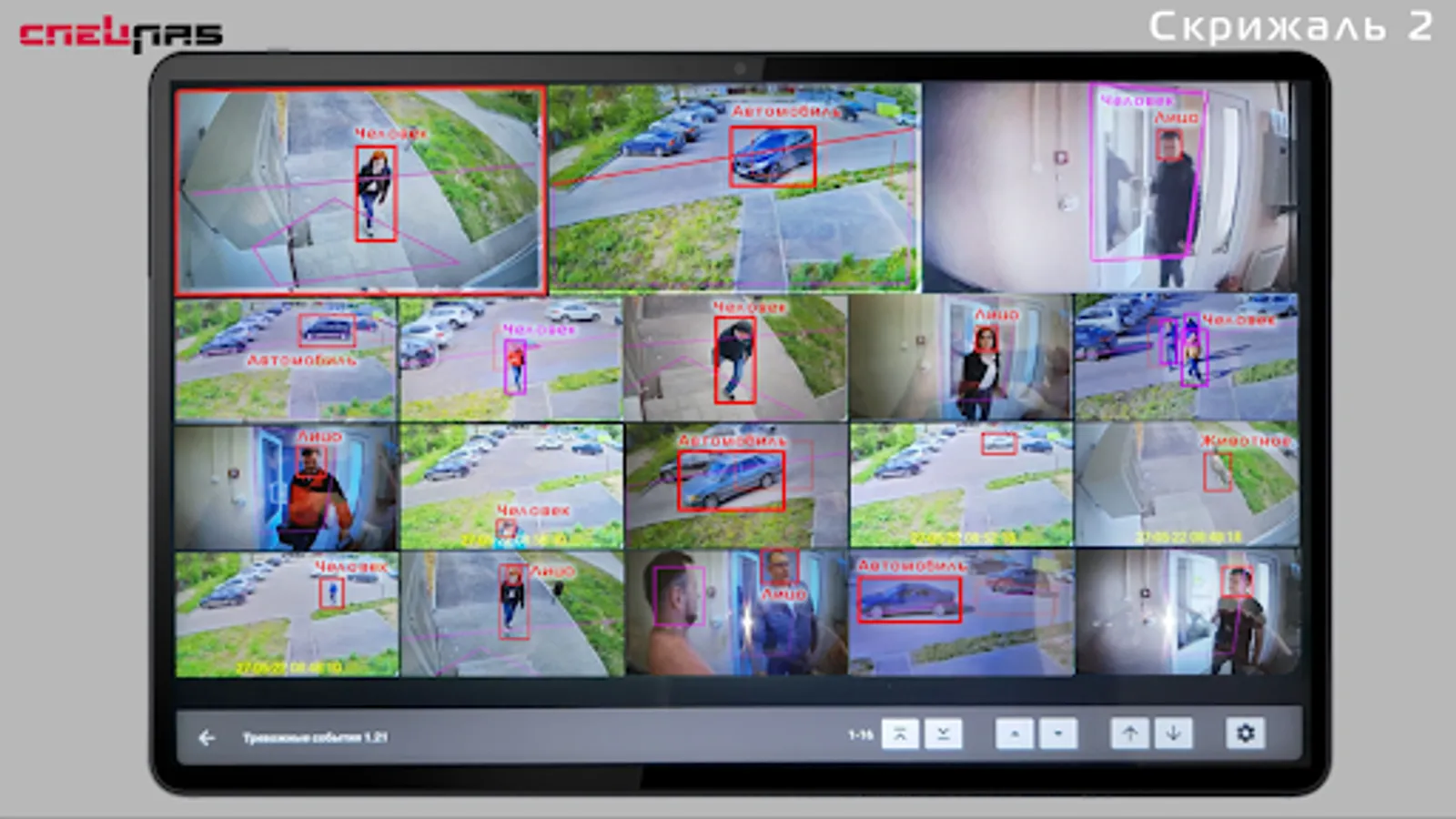 You can view each video camera in full screen in high resolution and follow the momentary actions. But this is not the main thing. Even if the cameras are not displayed for viewing, all 50 are simultaneously analyzed, and alarm video events are generated for them. The rest of the screen space is dedicated to the most important thing in today's security - event videos. You won’t watch all the cameras live 24 hours a day, and you won’t notice any quick actions there anyway, and rare video messages that don’t leave the screen will be displayed even if an attacker stole your car or just ran very -very fast. He has already hidden where there is no camera, and you still see how he got here.