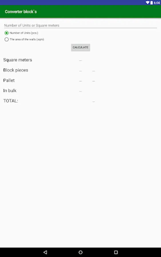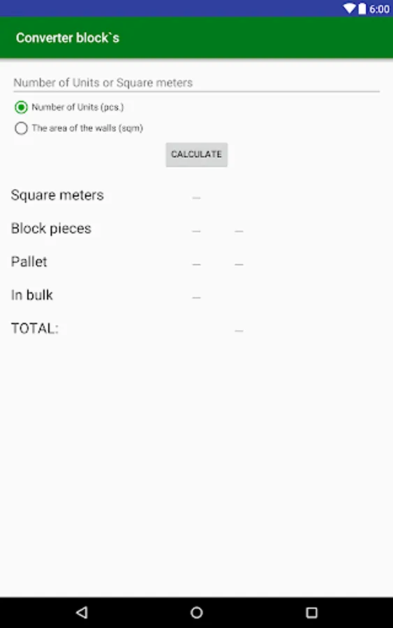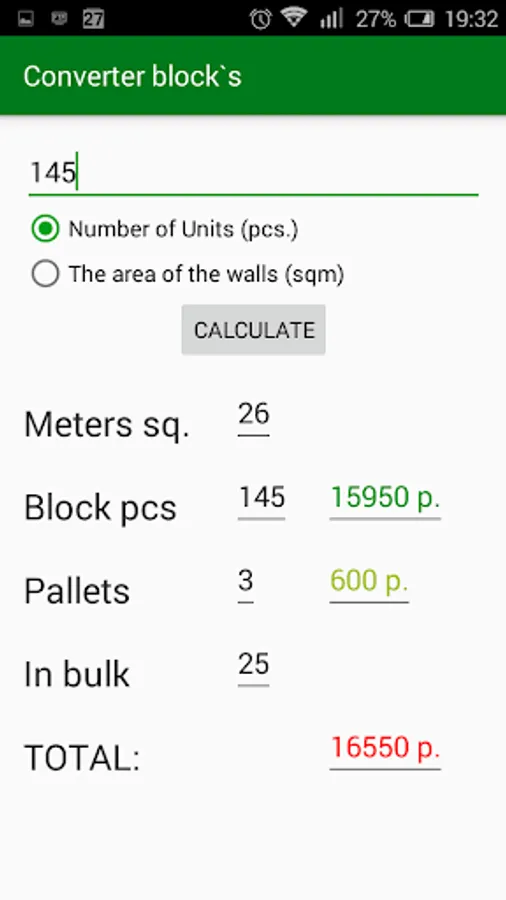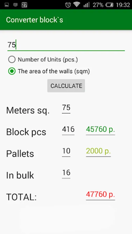 Application for transfer of the area of the walls erected in the amount required for the construction of standard foam blocks 20h30h60 centimeters. Also calculated the number and cost of the pallets for delivery. To calculate the value of the density of the foam blocks are taken D800. All prices are in Russian rubles at the moment. The price of one foam block depends on the number of (wholesale discount).