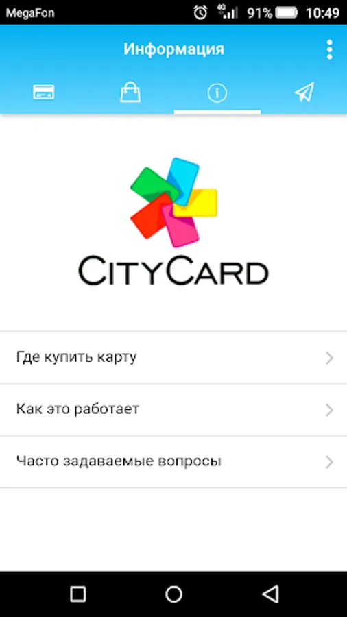 Mobile application duplicates the plastic card Sitikard (Sitikart). If your phone number is registered more than one card, the app prompts you to select and attach one of them to the smartphone. One card can be linked to only one device!