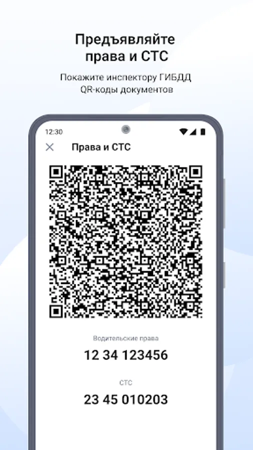 Present your driving license and STS in the form of a QR code at the request of a traffic police officer. Data about the driver and the car are loaded from the traffic police database and are always up to date.