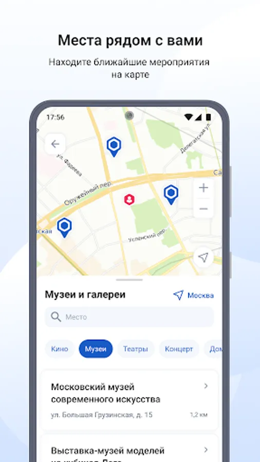 Find cinemas, museums, theaters, cultural centers on the map or in the list and get information about the place: description, address, opening hours, photos, schedule of events and ticket prices