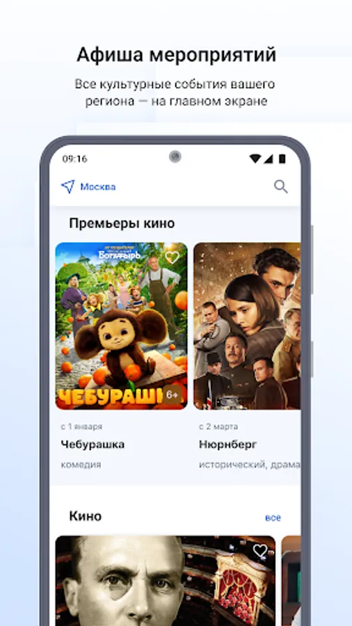 You will not miss an interesting film, concert or exhibition, wherever you are. Select your region and find out about upcoming events. The application will show which of them are nearby