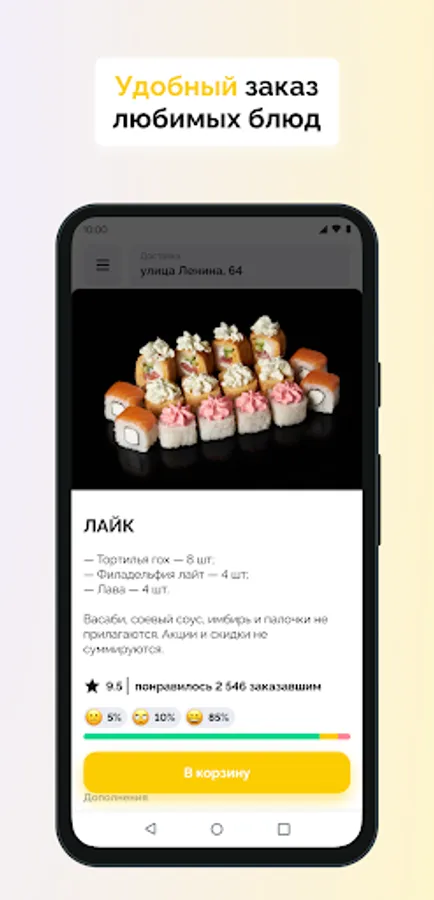 In 2008, we had a wonderful idea to open a delivery of sushi and rolls in the city of Krasnoyarsk. The idea was realized and in December of the same year we sent our first orders. Today we have several branches and for many years we have been delighting our customers with always fresh and tasty rolls and not only, our assortment includes pizza, sushi, Wok, snacks and other tasty treats.