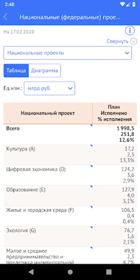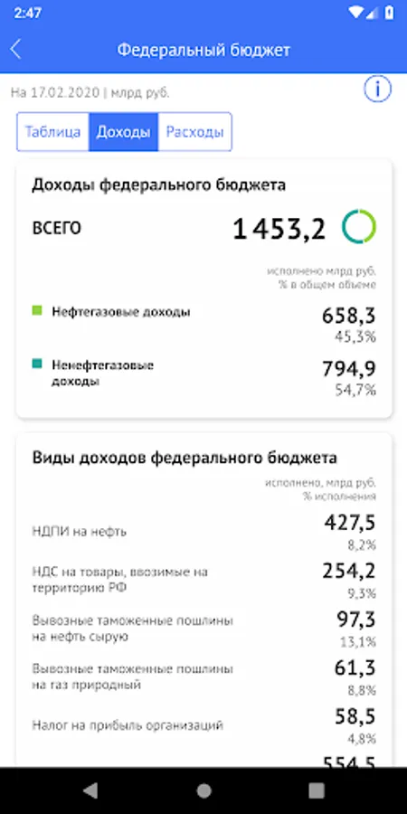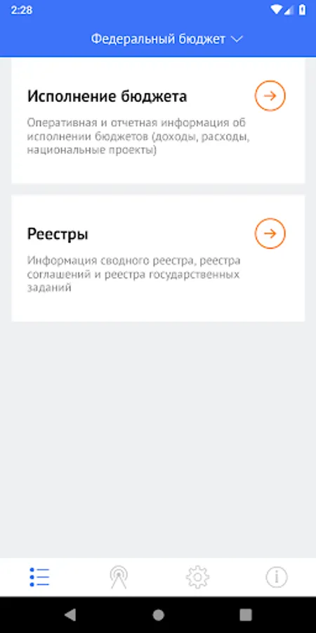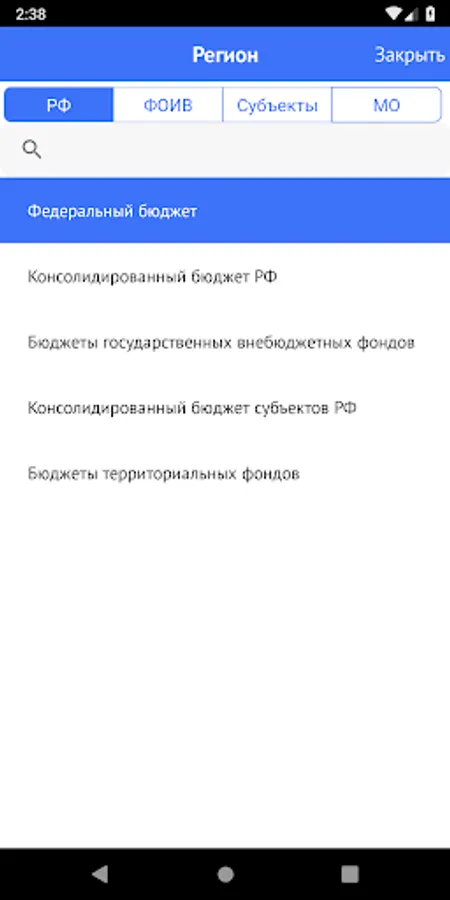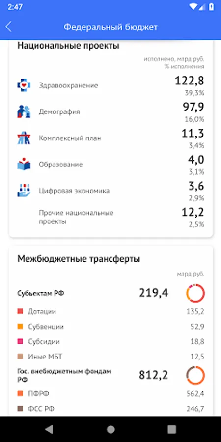 The Budget.RF mobile application of the Unified Portal of the Budget System of the Russian Federation provides openness and accessibility for citizens and organizations of information on the financial and economic activities of public law entities and state extra-budgetary funds.